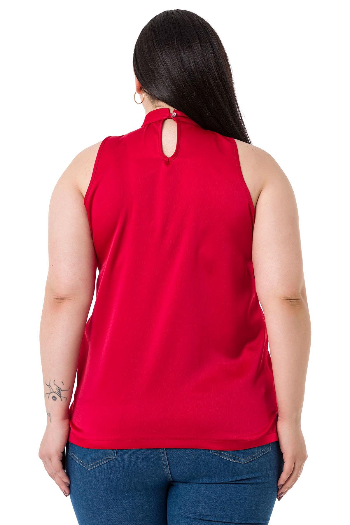 A large size neck scarf back button closure sleeveless side slit satin blouse.