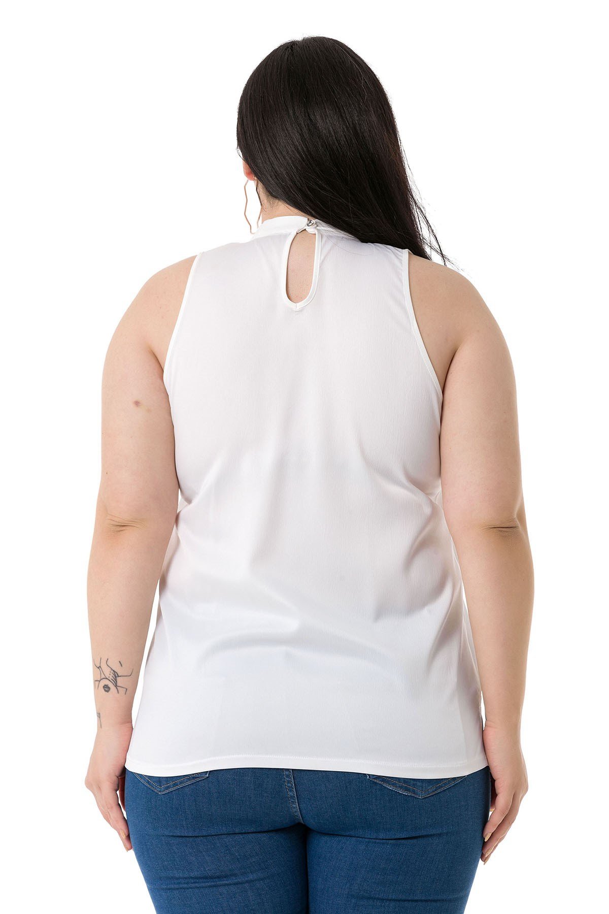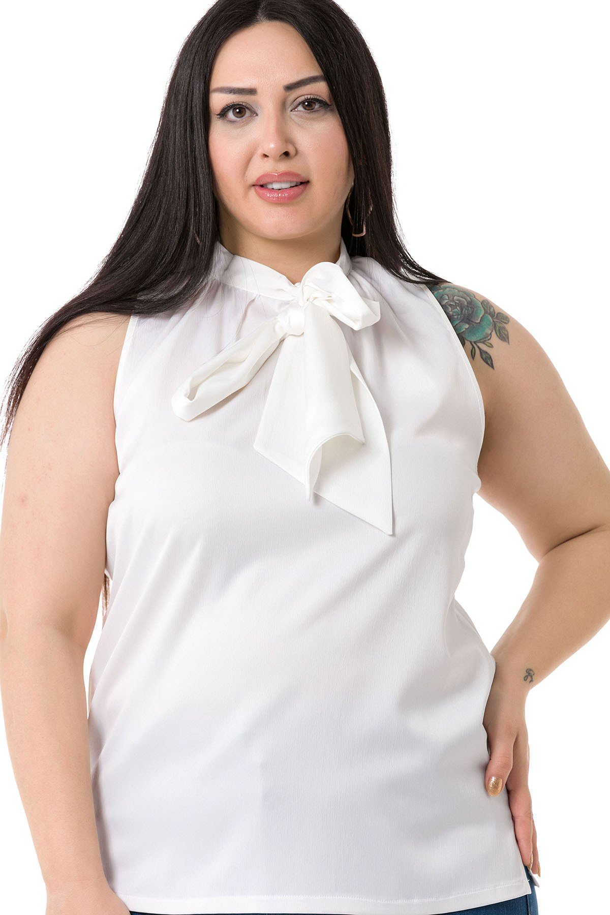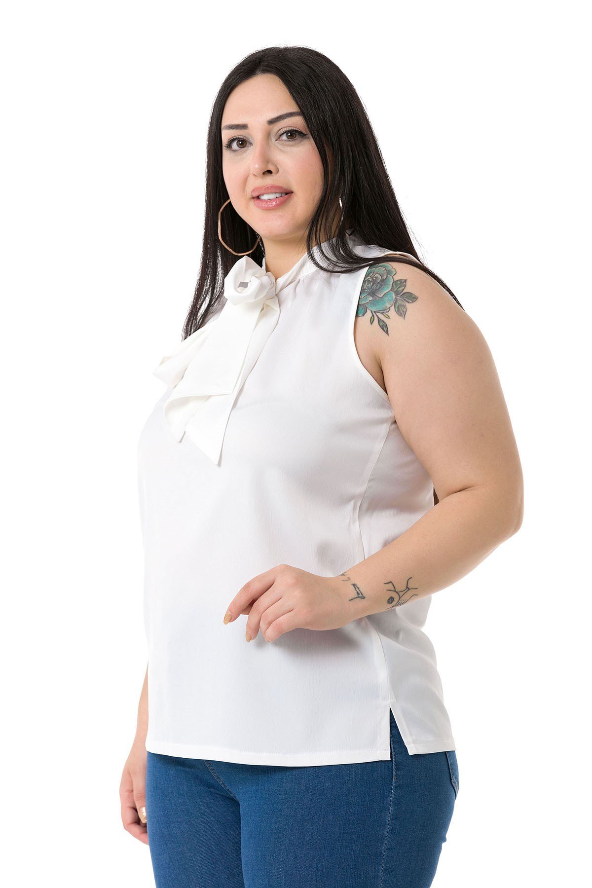 Large size satin blouse with scarf neckline, button closure at the back, sleeveless and side slit.