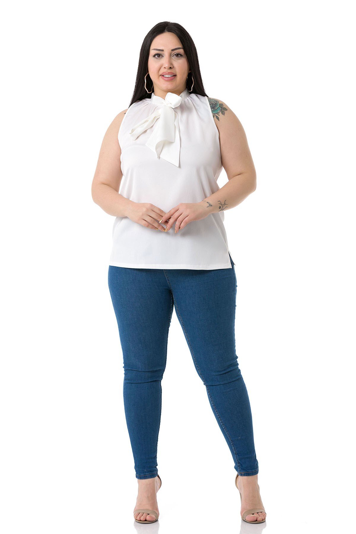 Plus Size Satin White Blouse with Scarf Collar and Side Slits