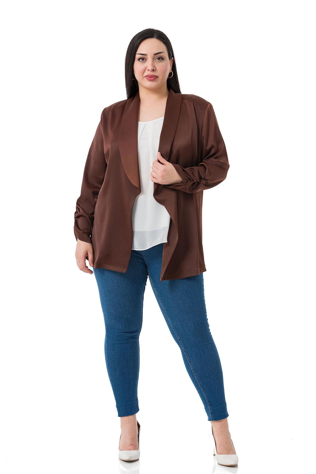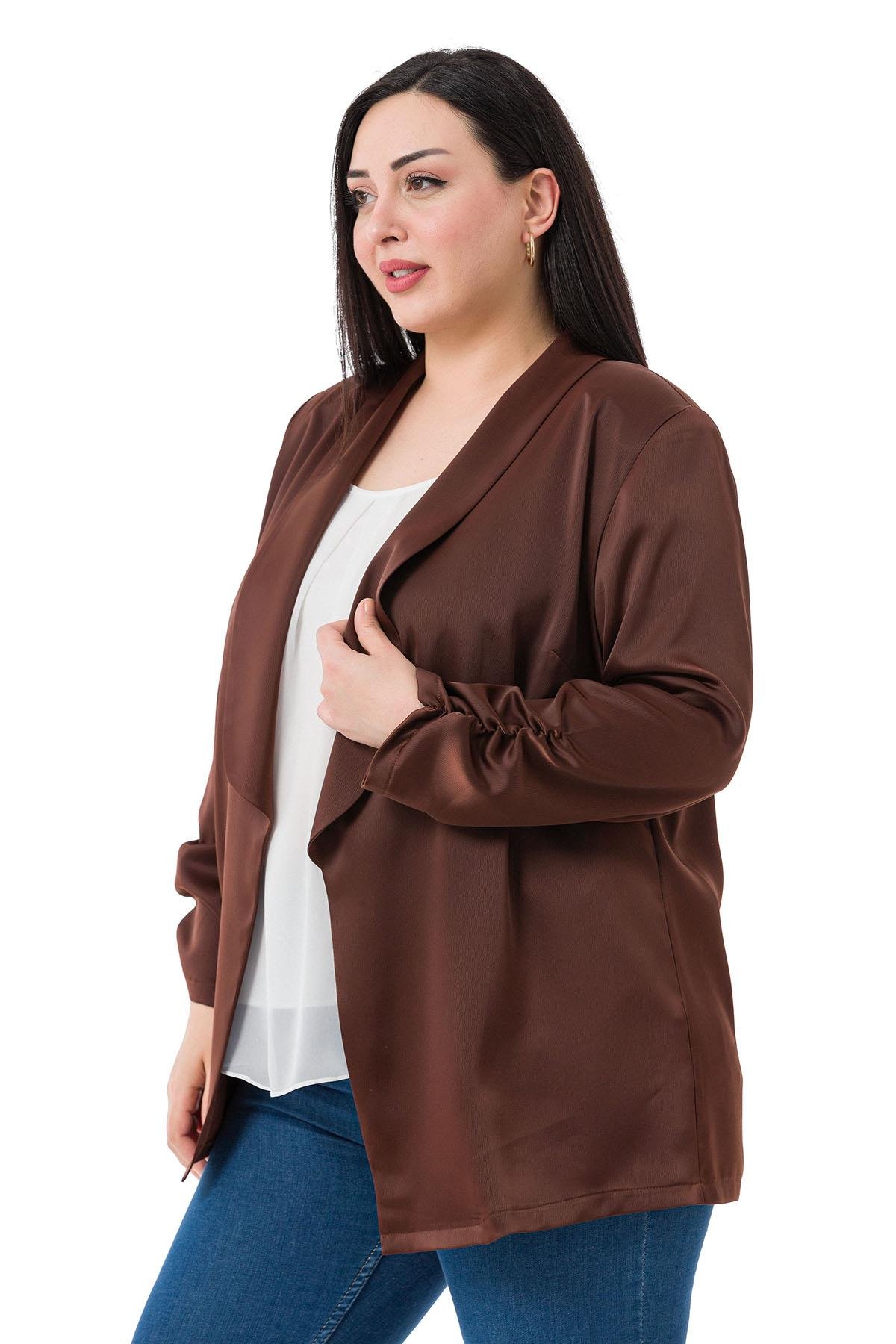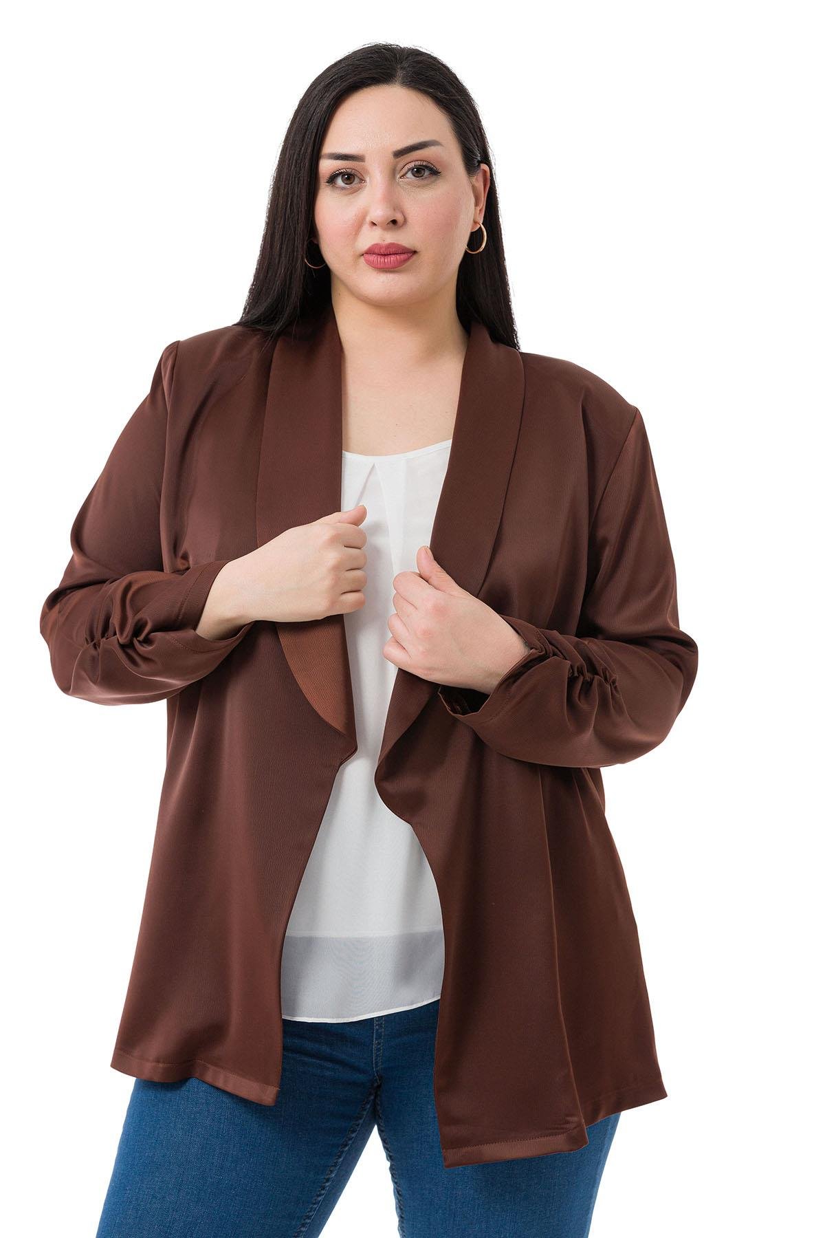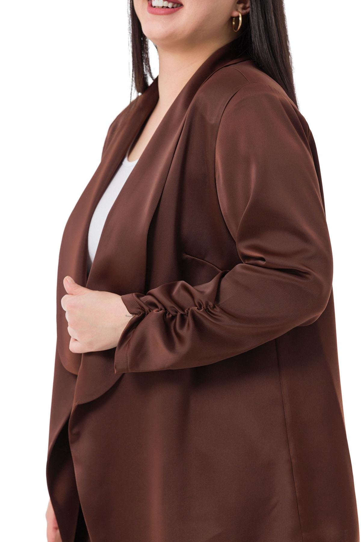 Plus size shawl collar, unlined satin jacket with gather detail on sleeves.