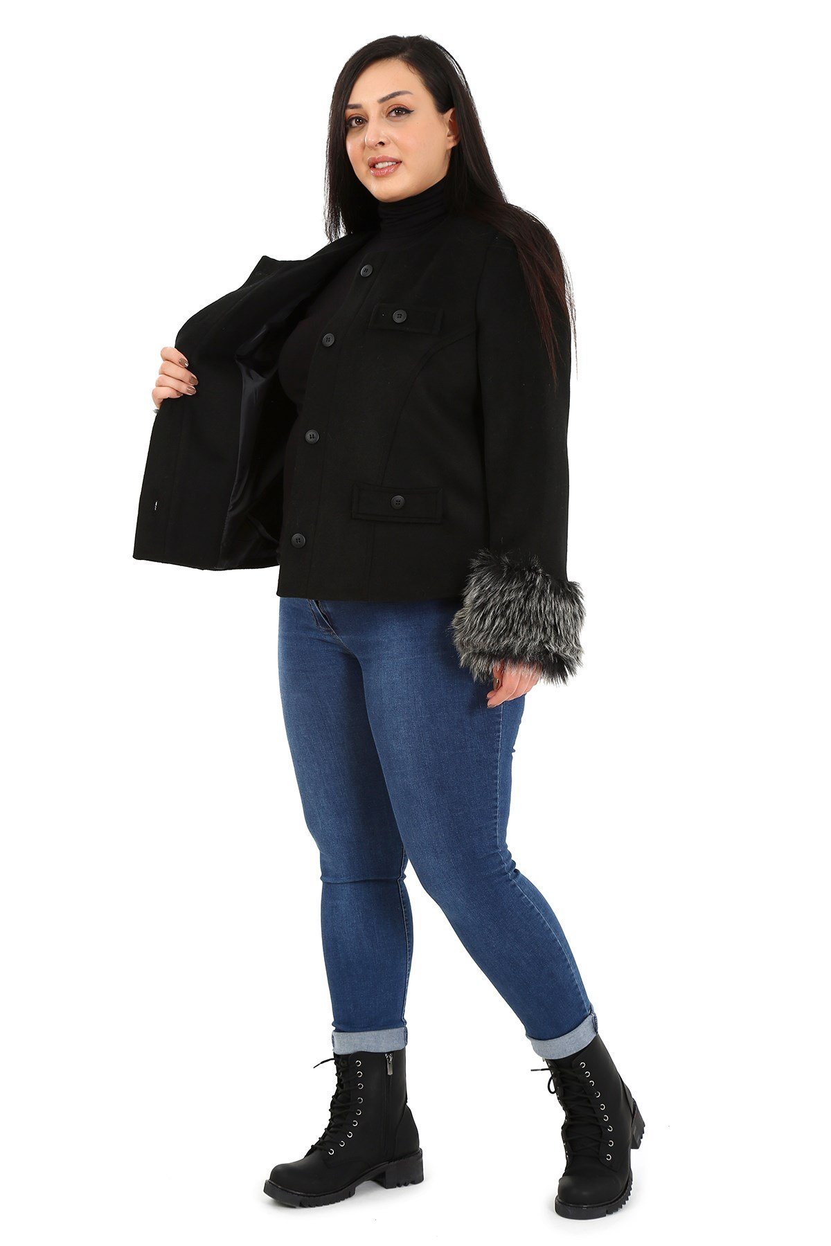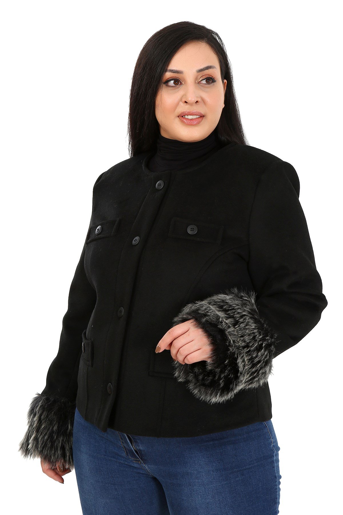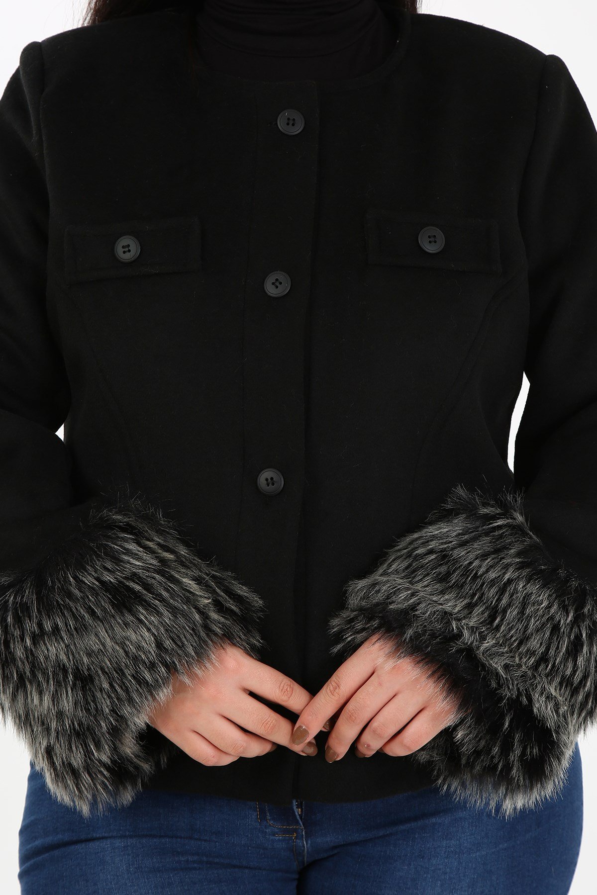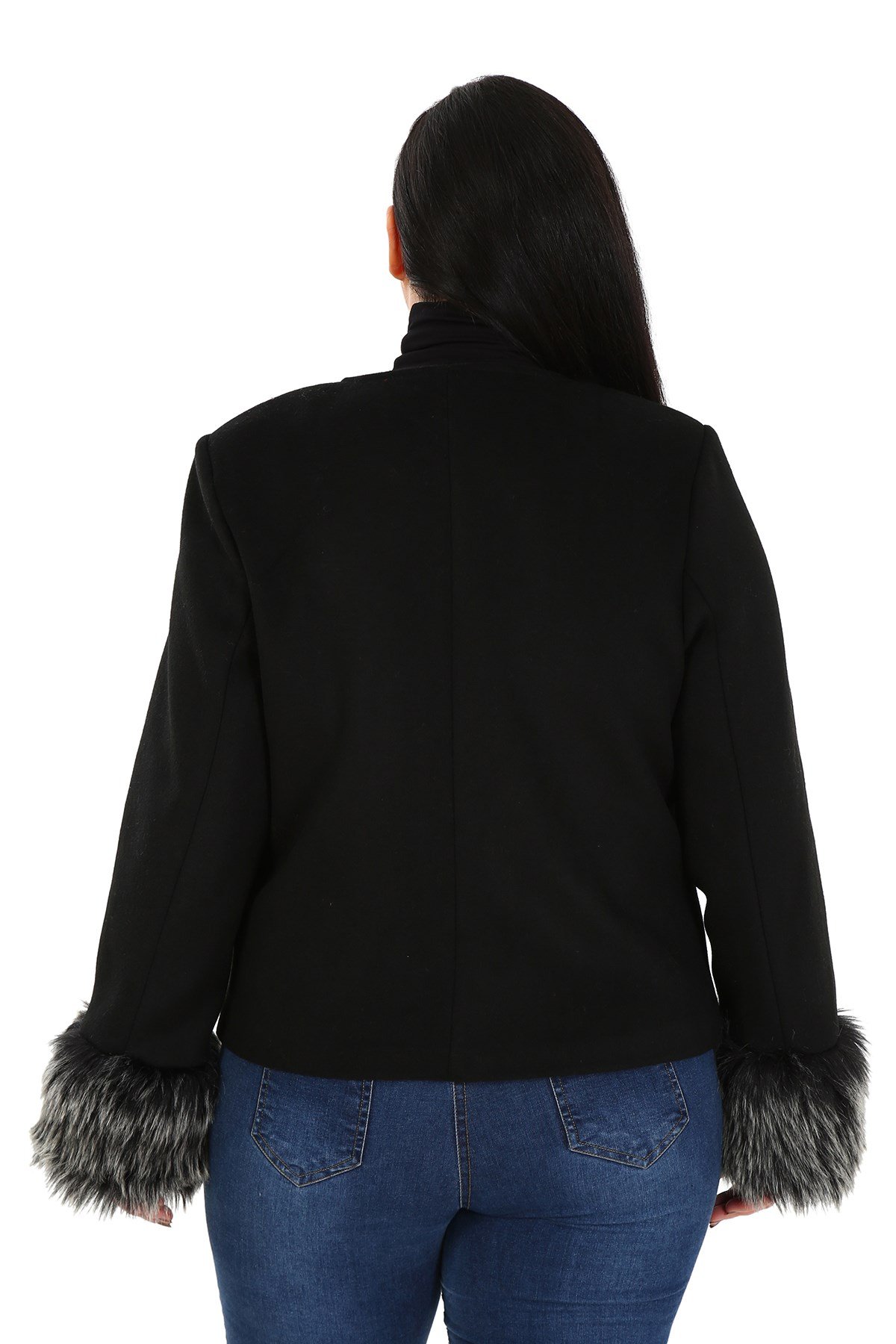 Plus Size Short Black Jacket with Fur Sleeves Fake Pockets and Lining