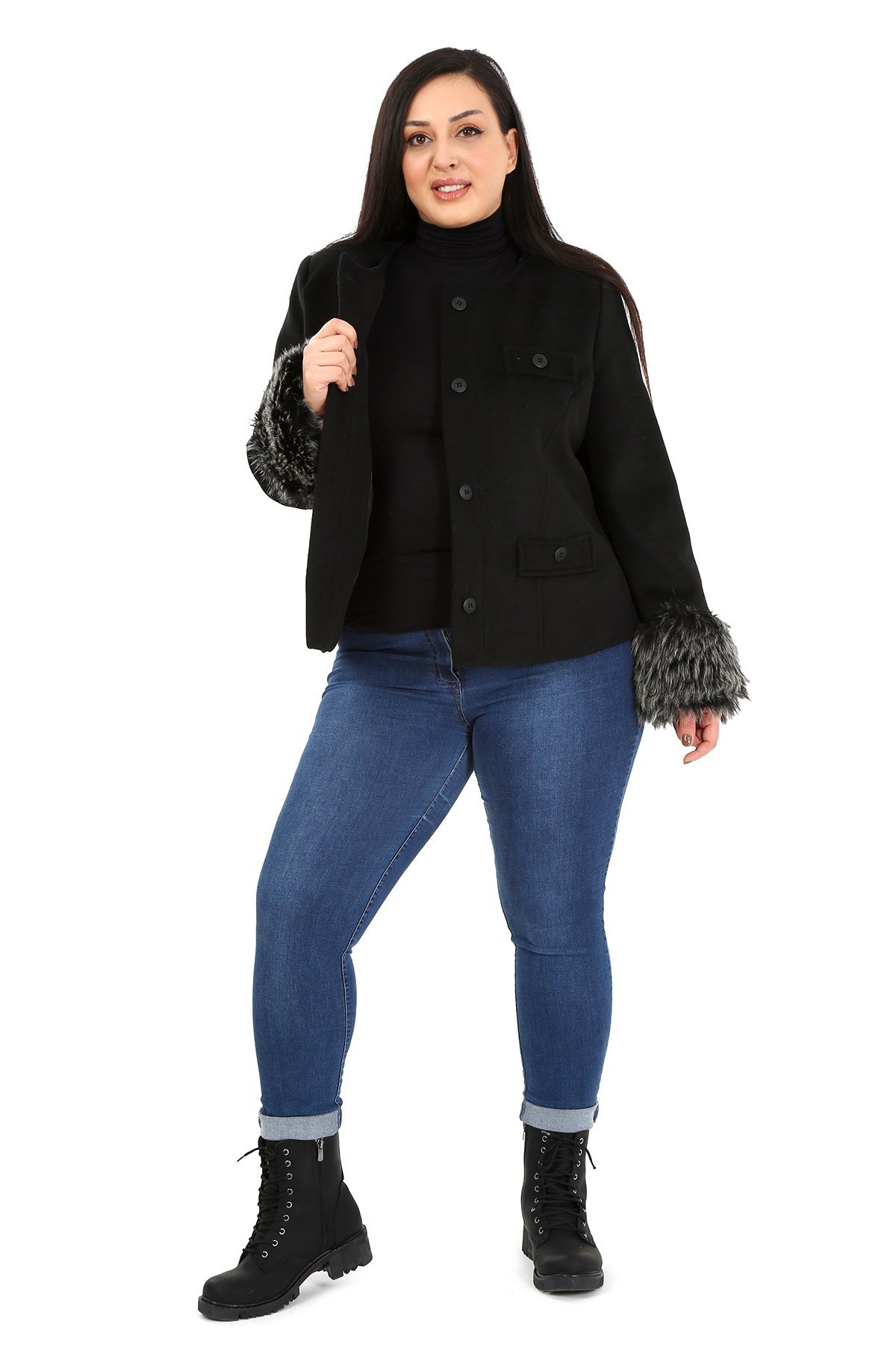 Plus size short jacket with faux fur sleeves and buttoned lining.