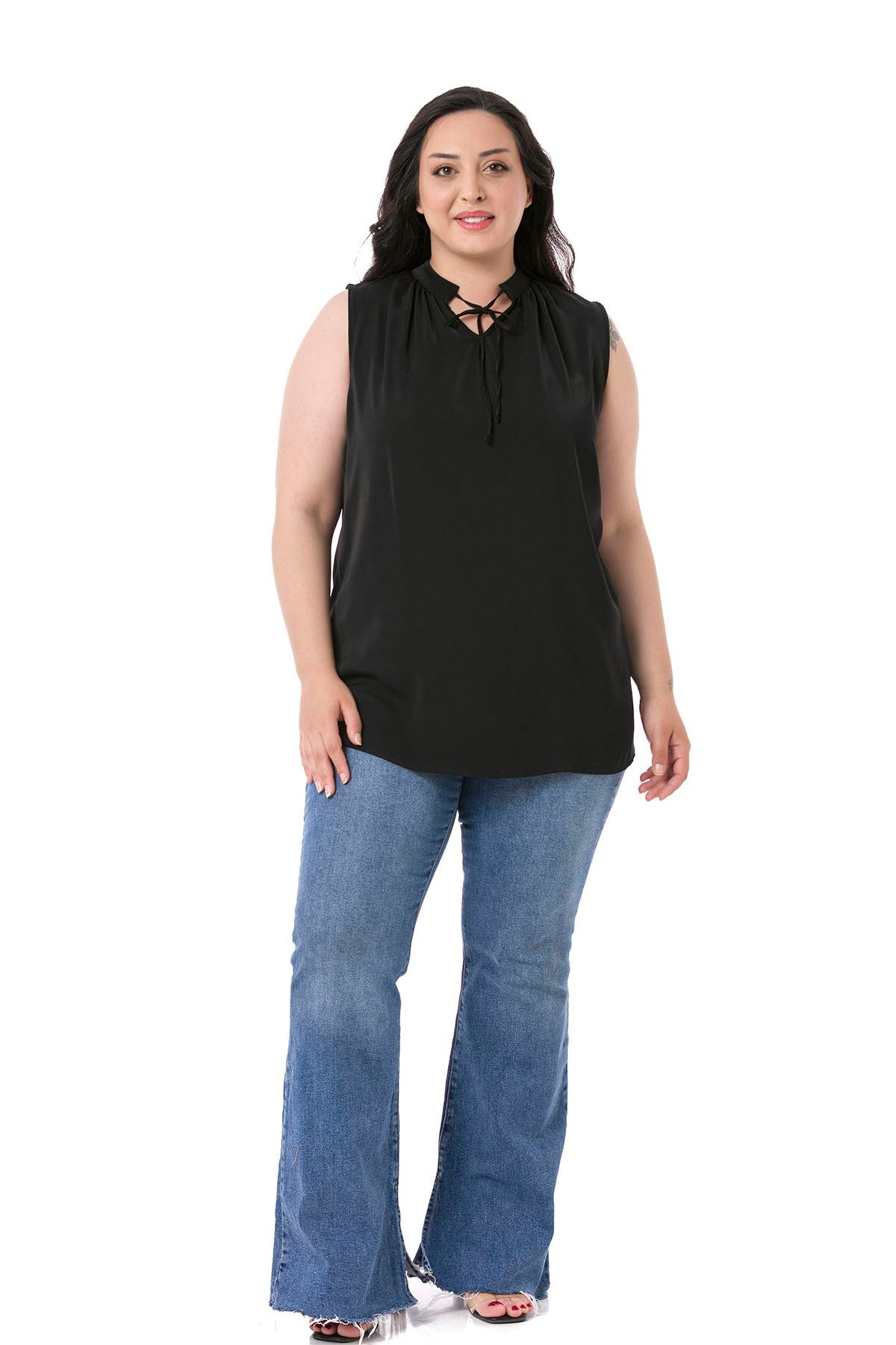 Plus Size Sleeveless Black Blouse with Tie-Down Collar High Collar and Side Slits