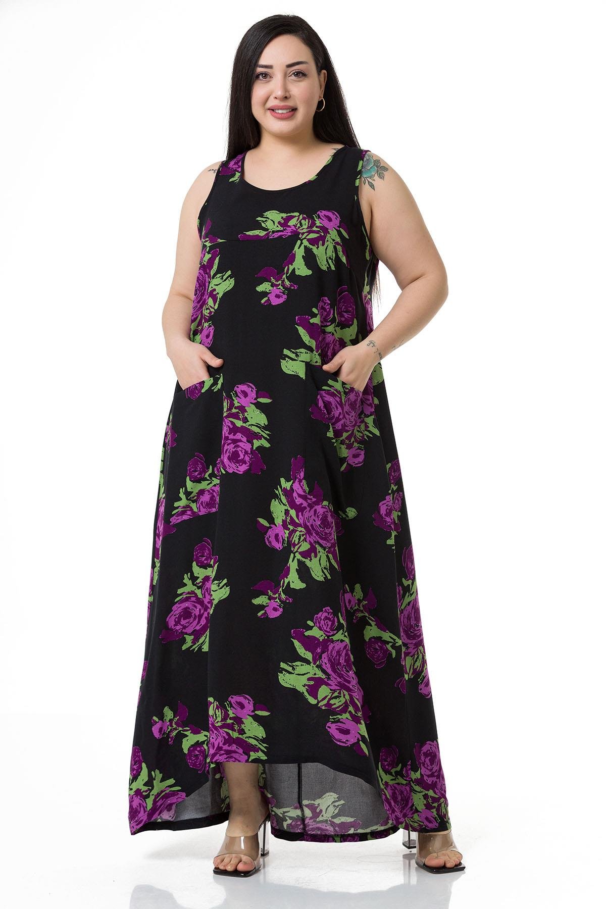 Plus Size Thick Strap Long Orange Floral Viscose Dress with Bag Pockets Plus Size Thick Strap Green Floral Long Viscose Dress with Bag Pockets