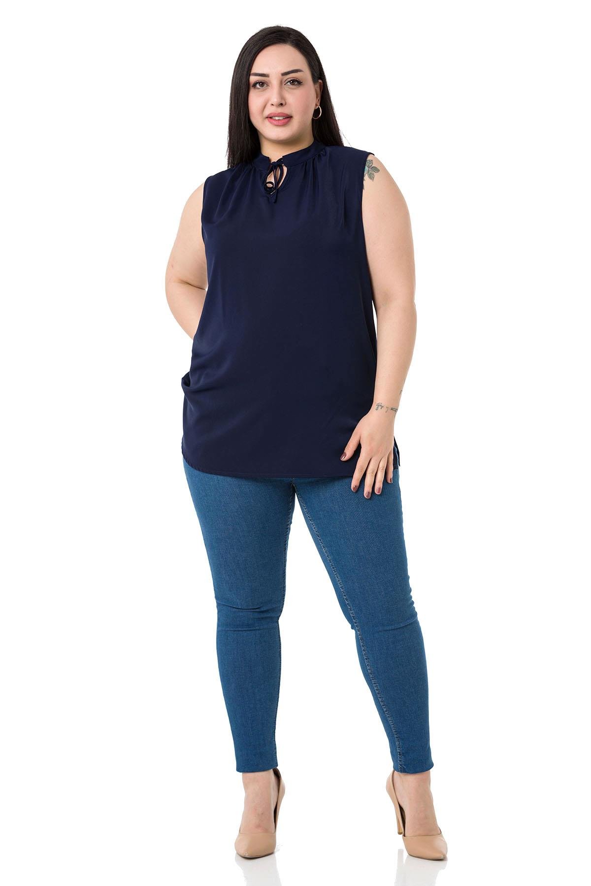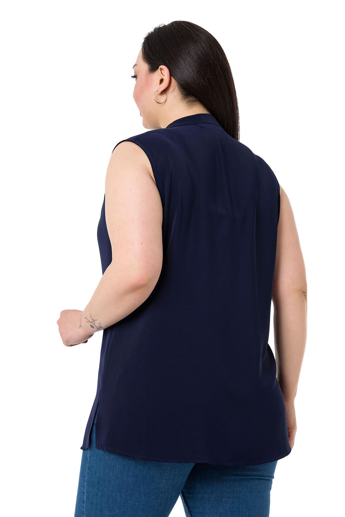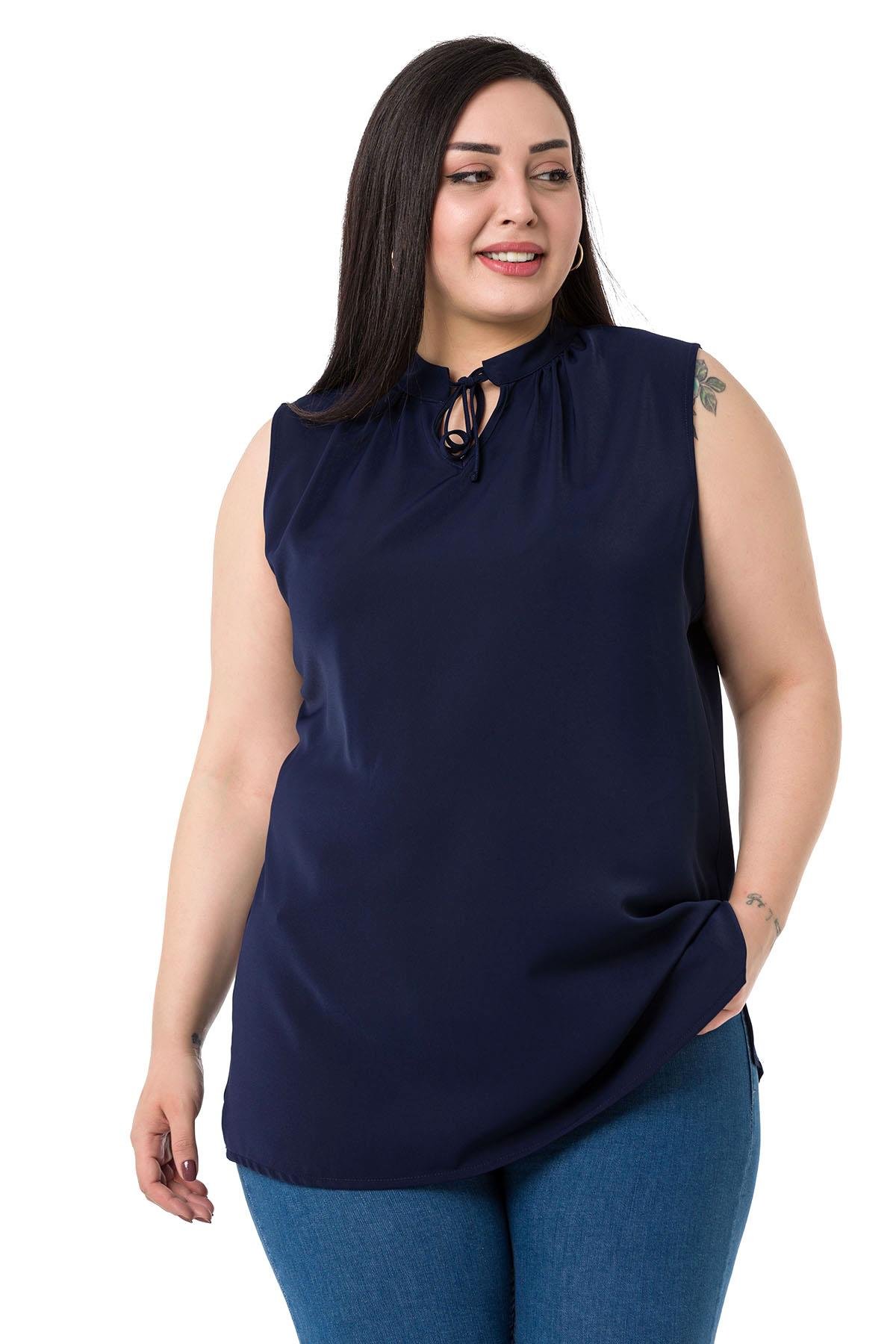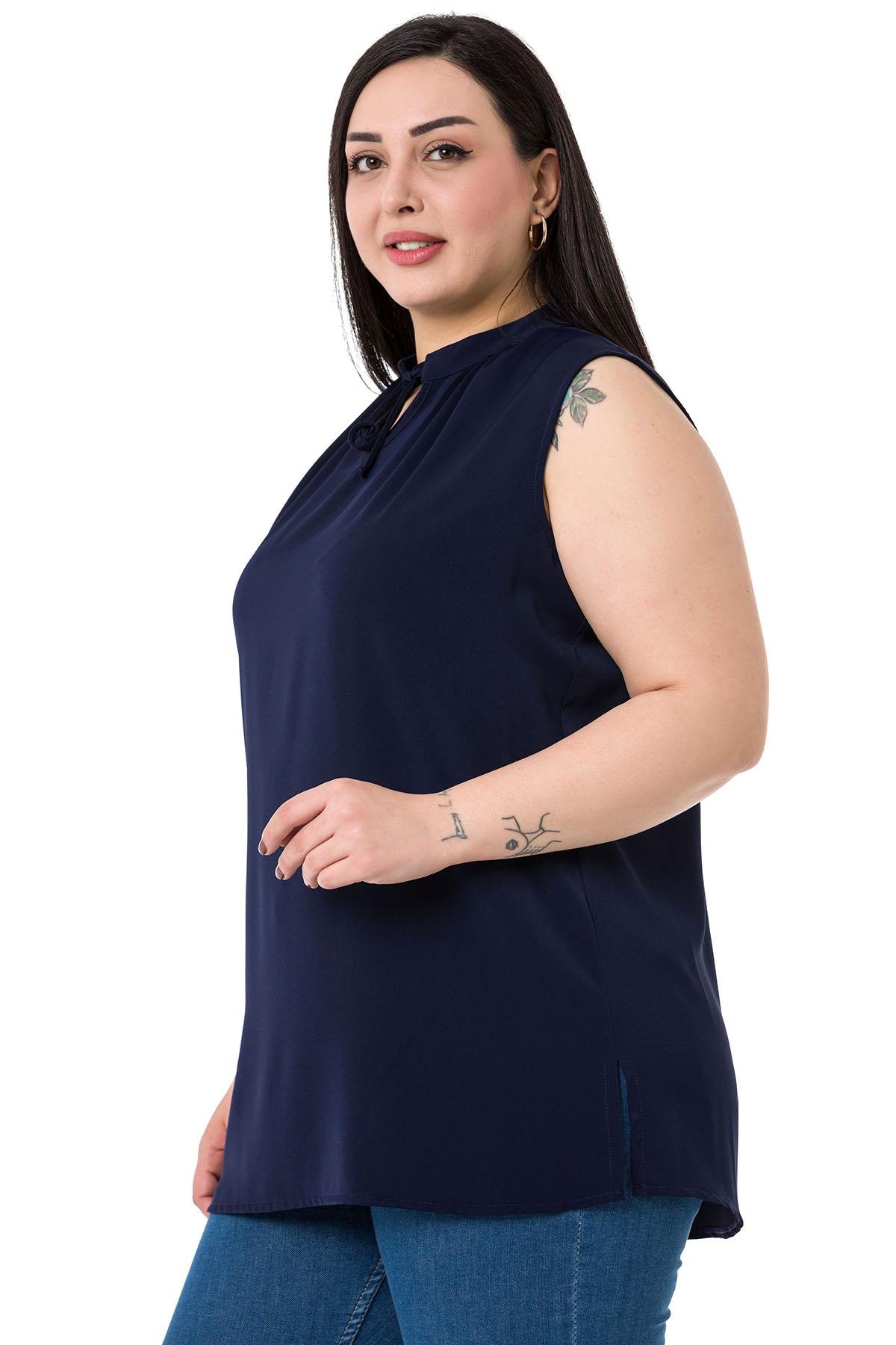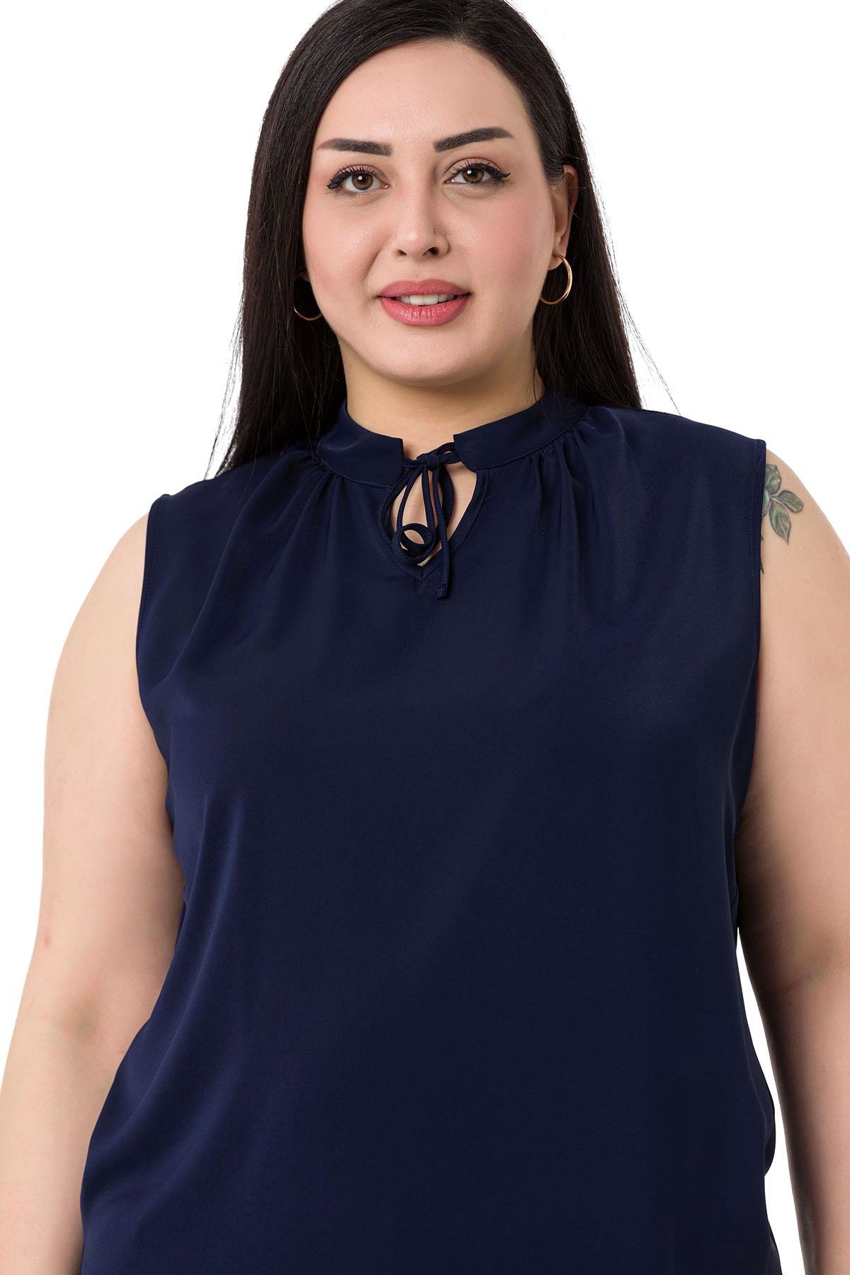 Plus Size Tie-Down Collar Stand-Up Collar Side Slits Flowy Sleeveless Navy Blue Blouse