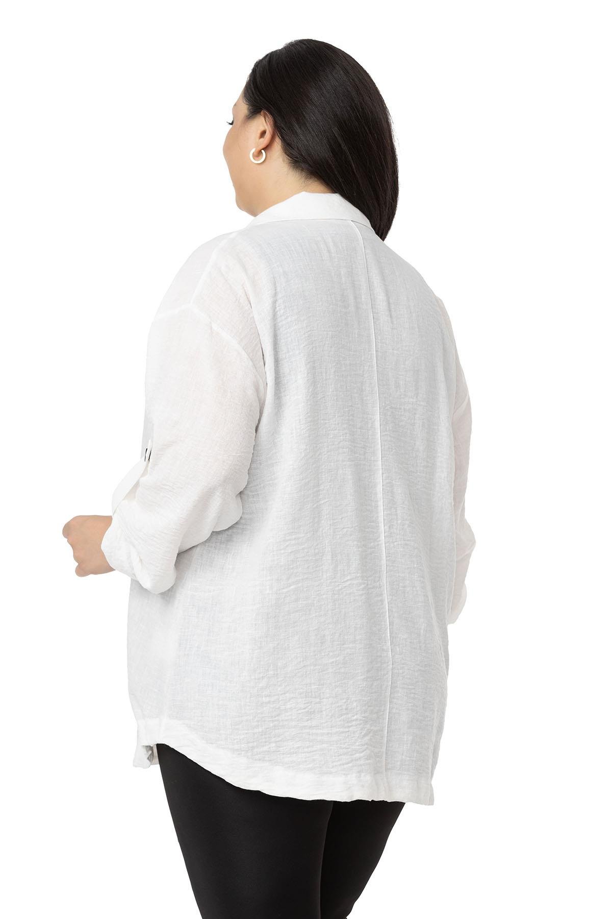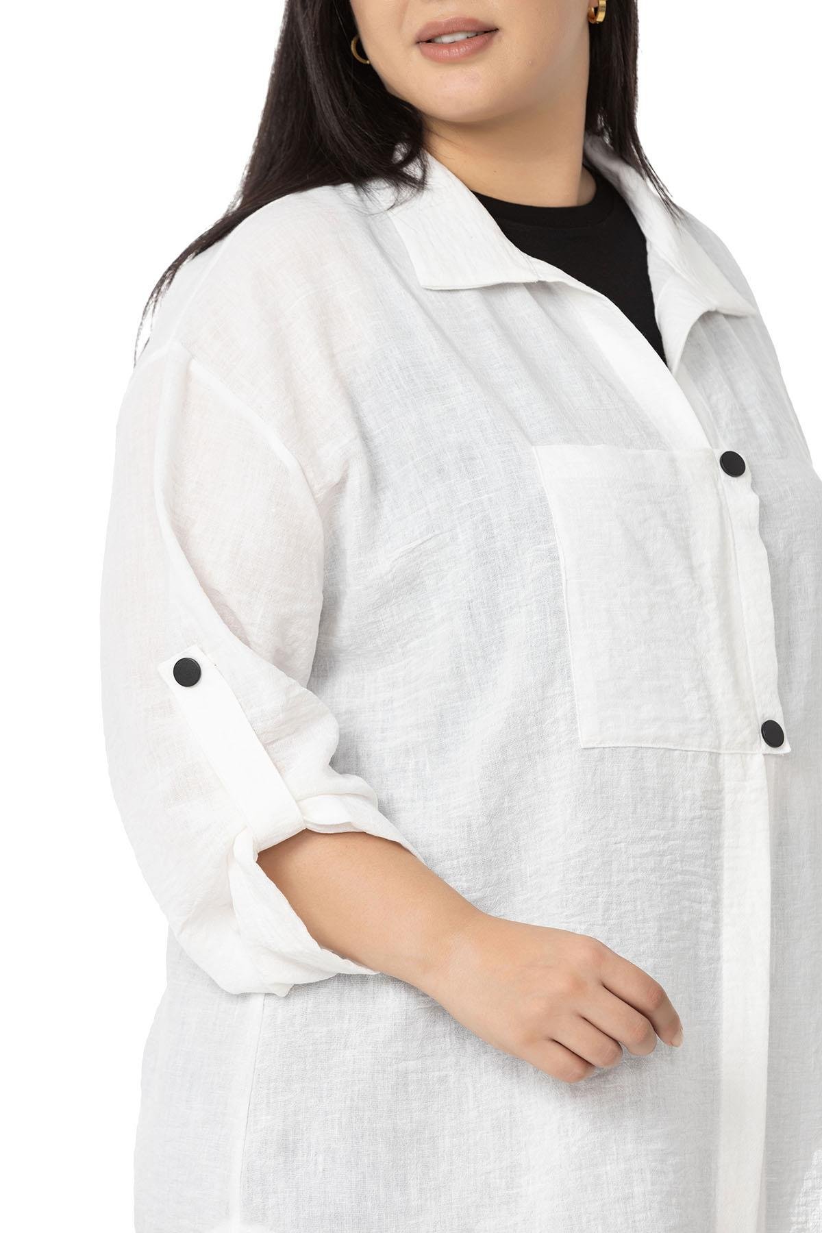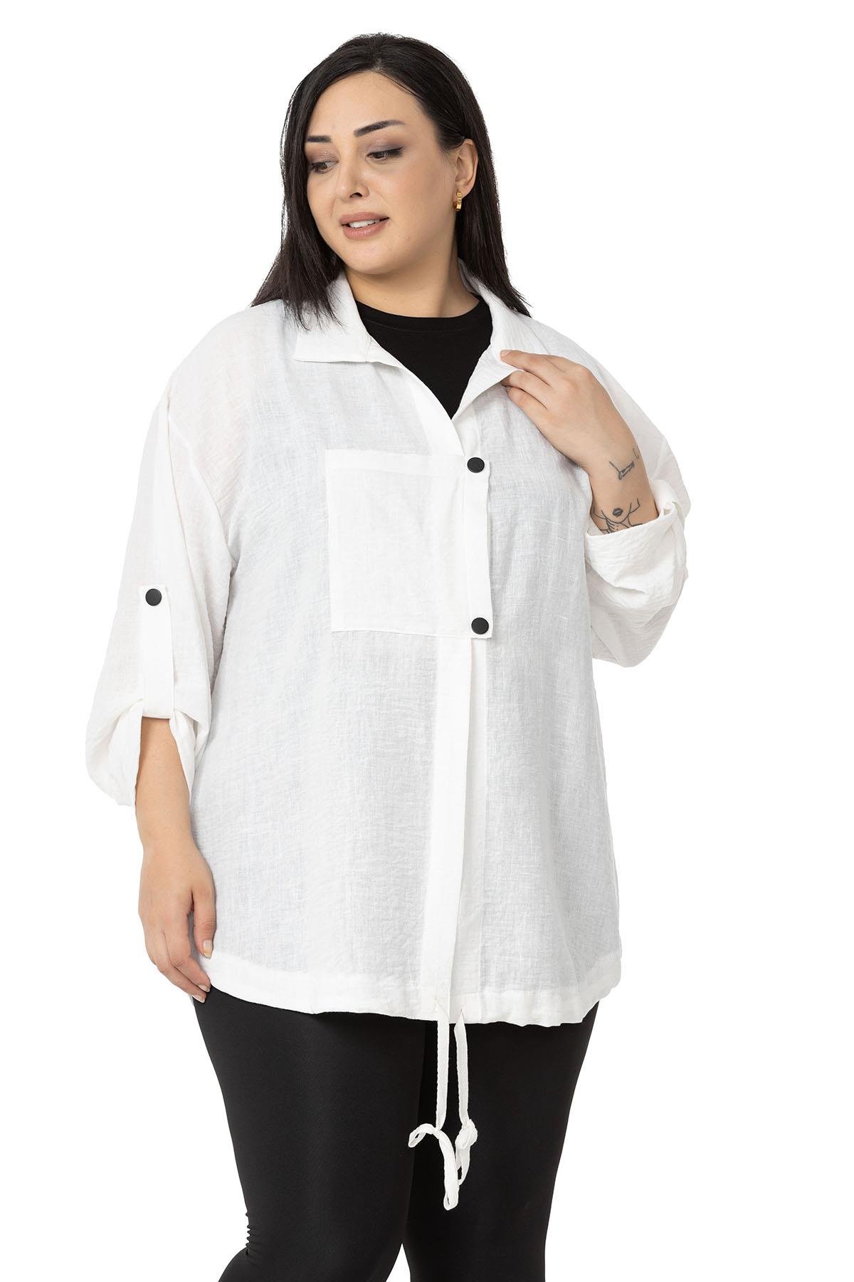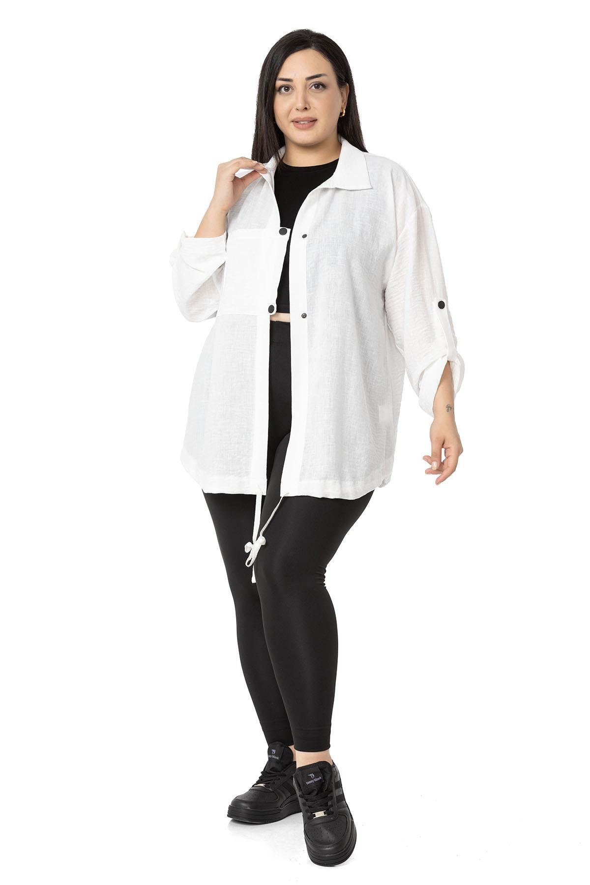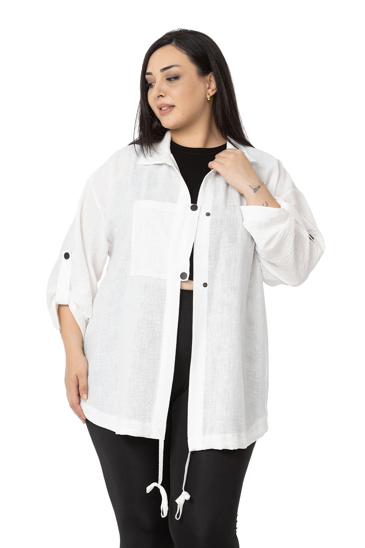 Plus size jacket with pocket detail, folded sleeves, gathered skirt and snap fastener closure.