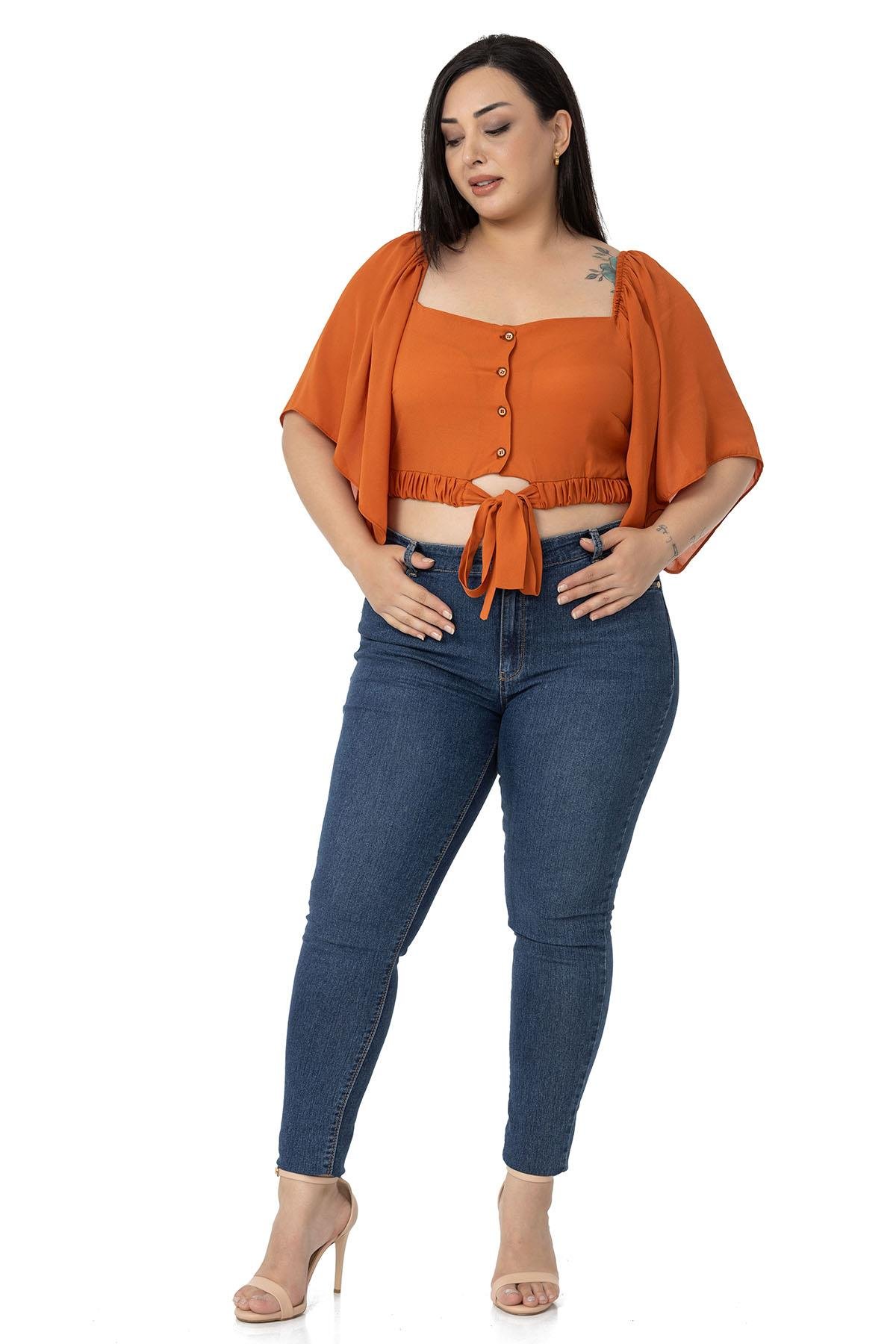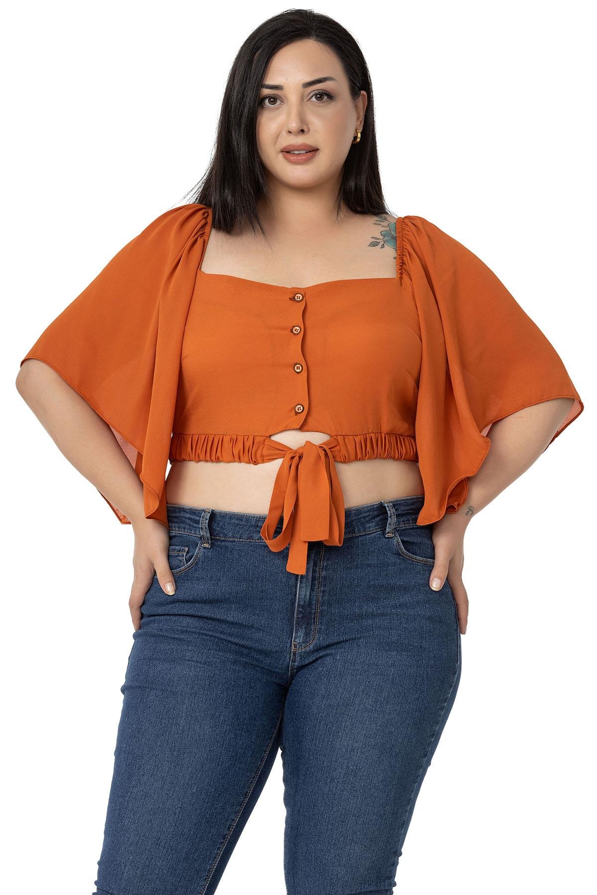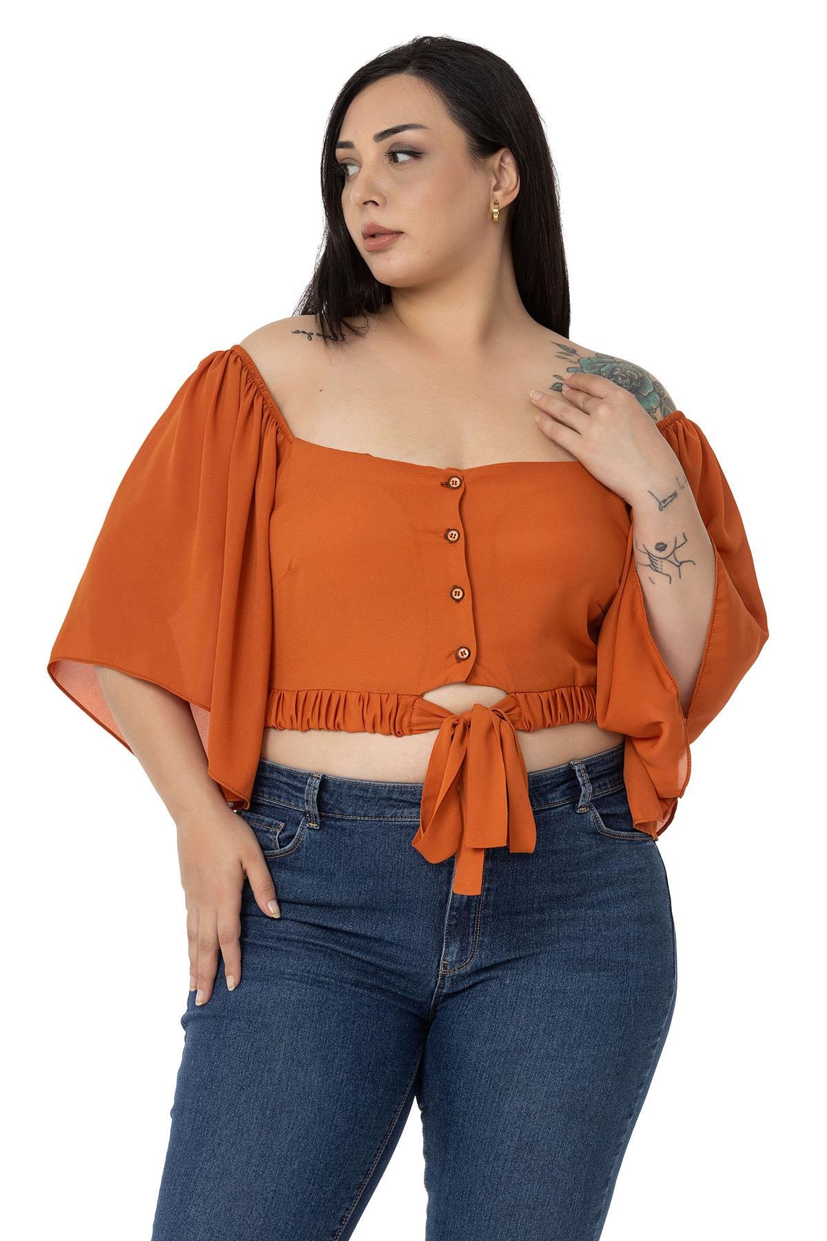 Large size wide sleeved elastic waist and drawstring elastic shoulder tie detail buttoned crop blouse.