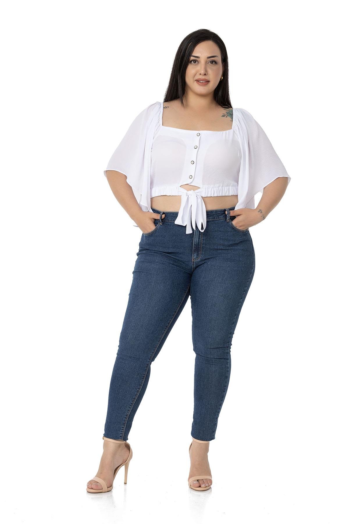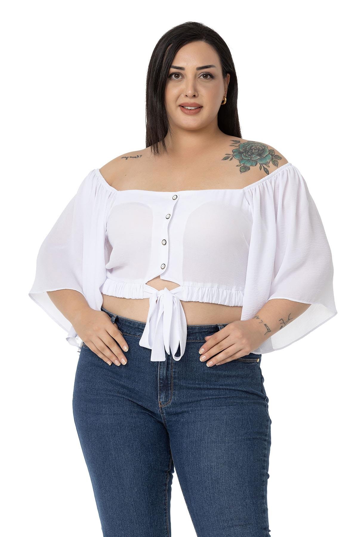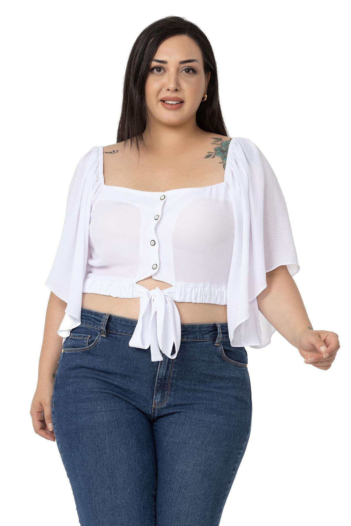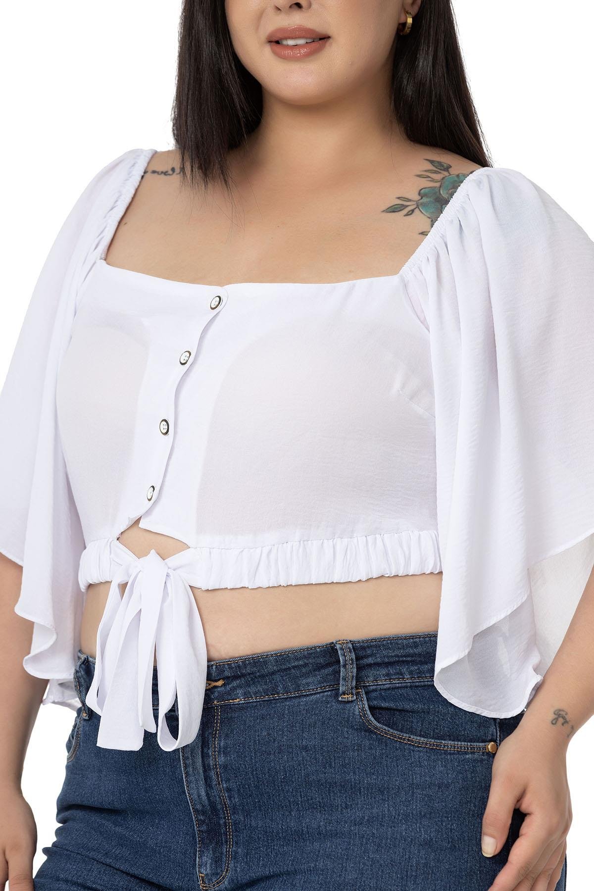 Large size wide sleeved elastic waist and drawstring elastic shoulder tie detail buttoned crop blouse.