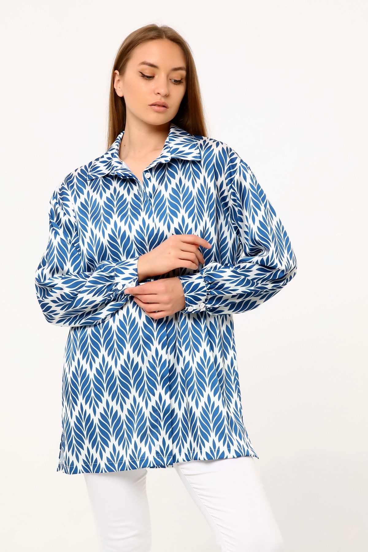 Yaprak Desenli Gömlek Yaka Manşetli Baskılı Saten İndigo Kadın Gömlek