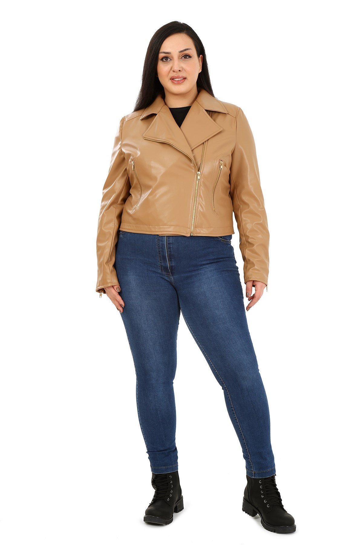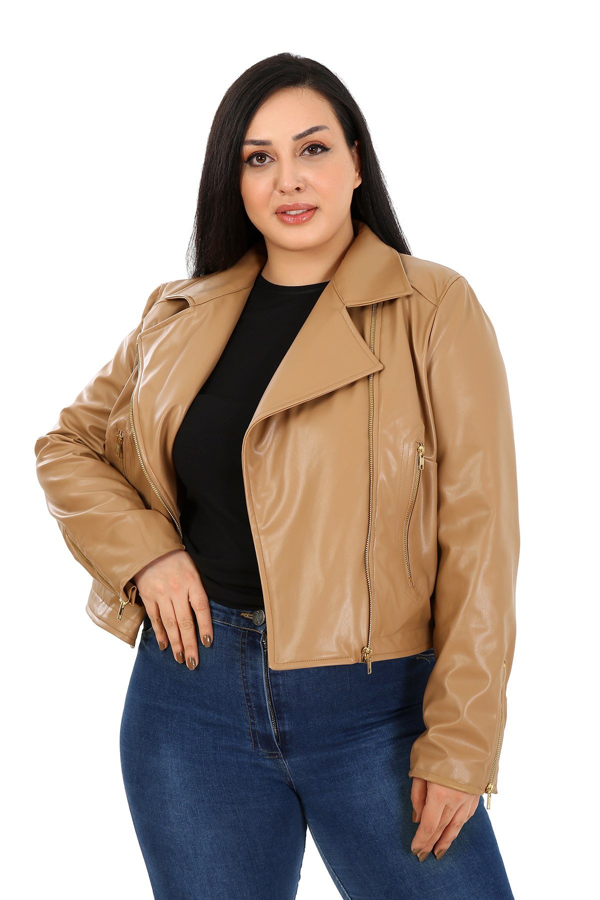 Plus Size Beige Short Leather Coat with Zipper Detailed Pockets