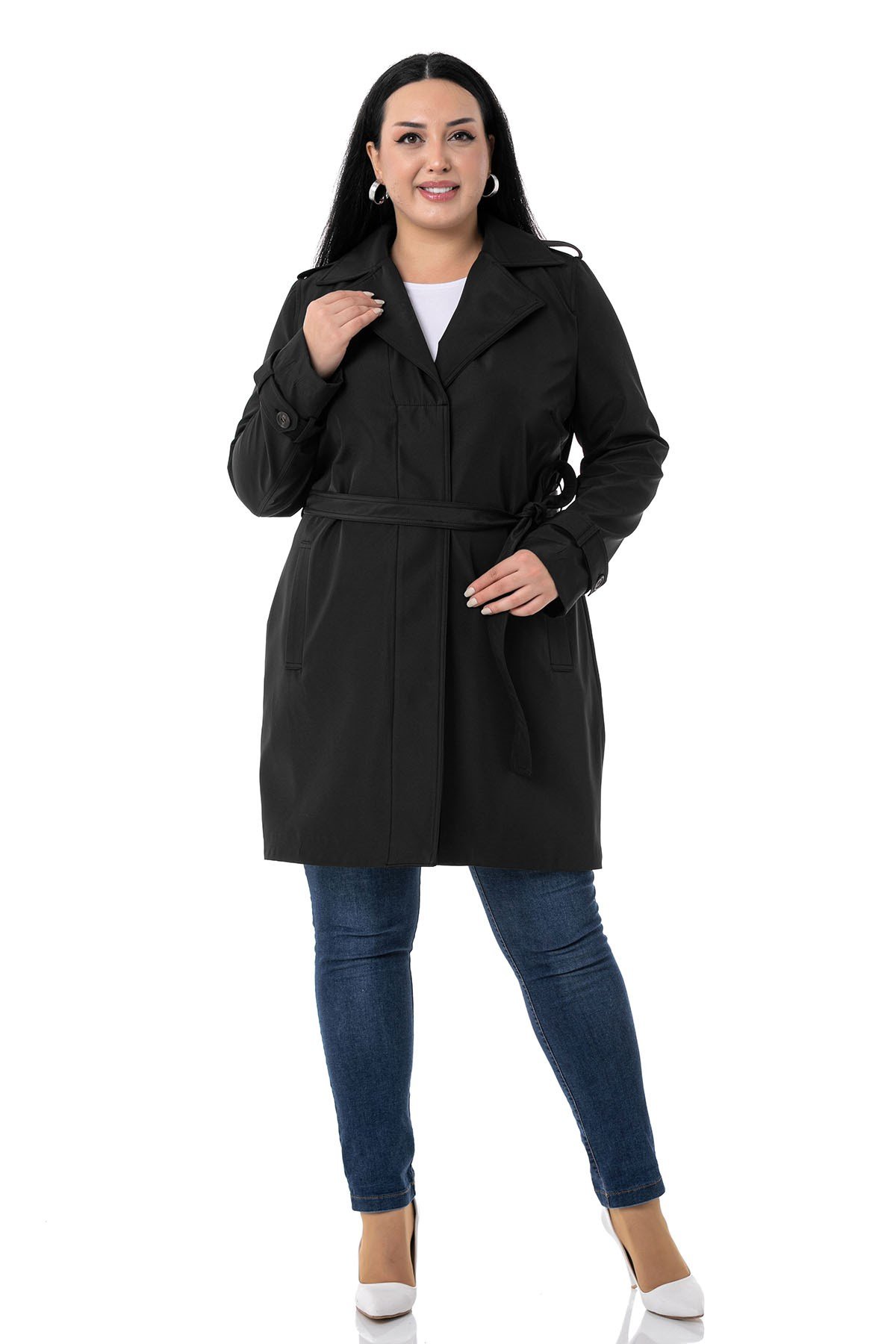 Plus Size Black Trench Coat with Hidden Buttons and Epaulettes