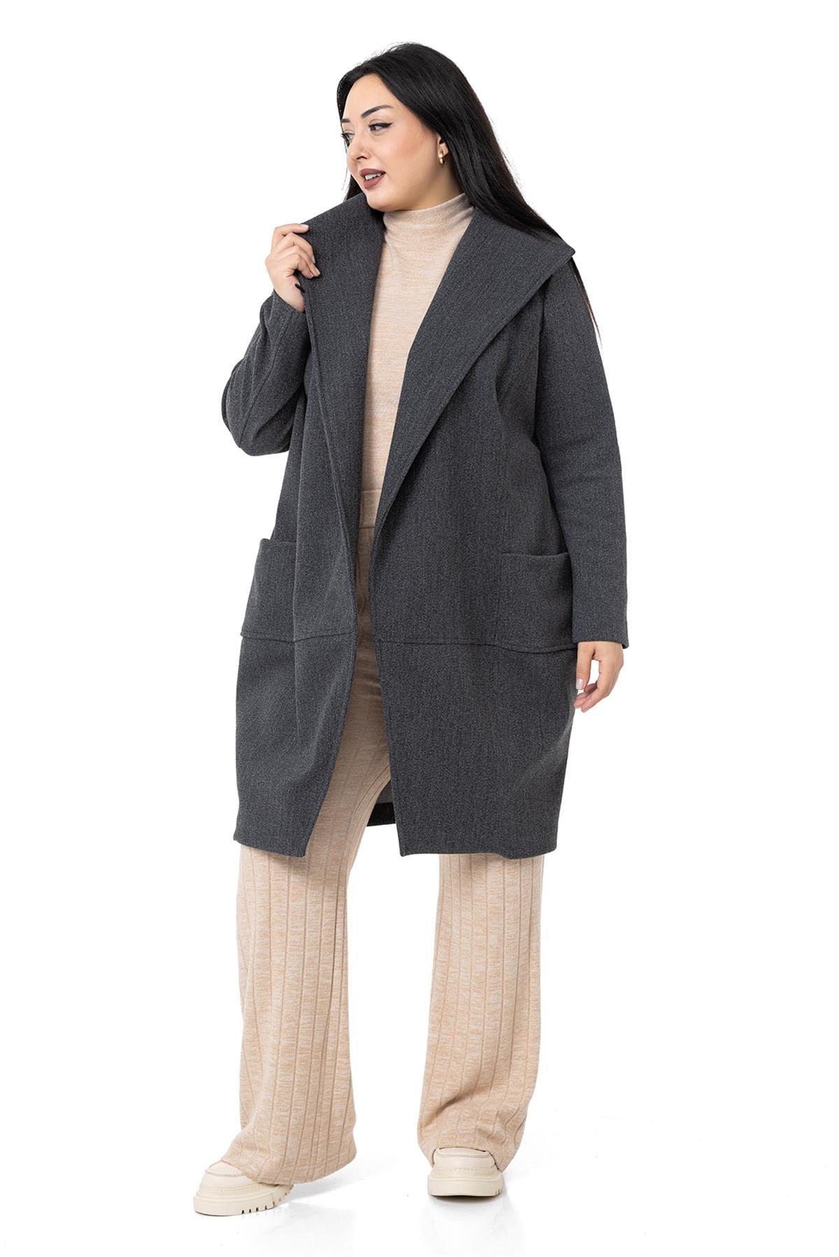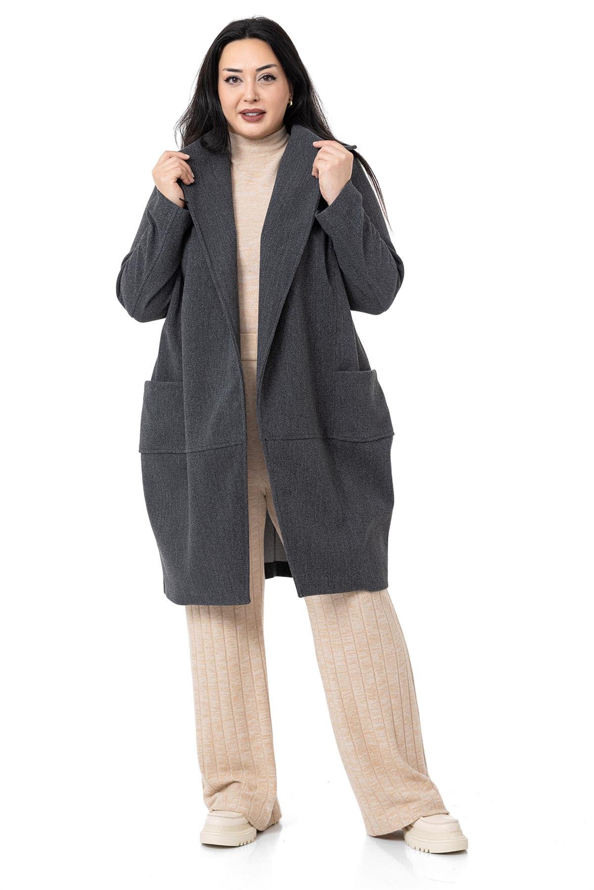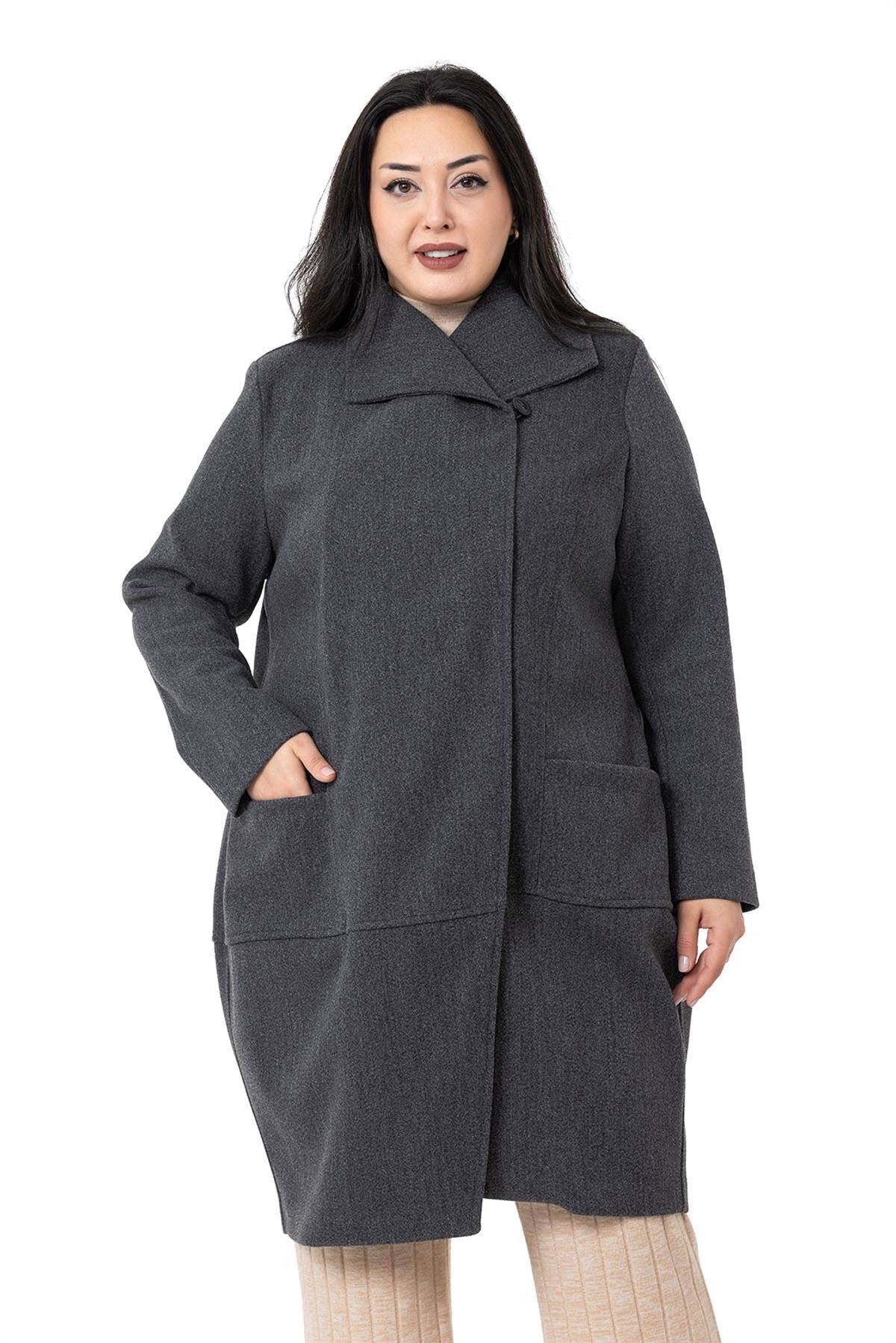 Plus size coat with collar detail, unlined, bag pockets, button closure.