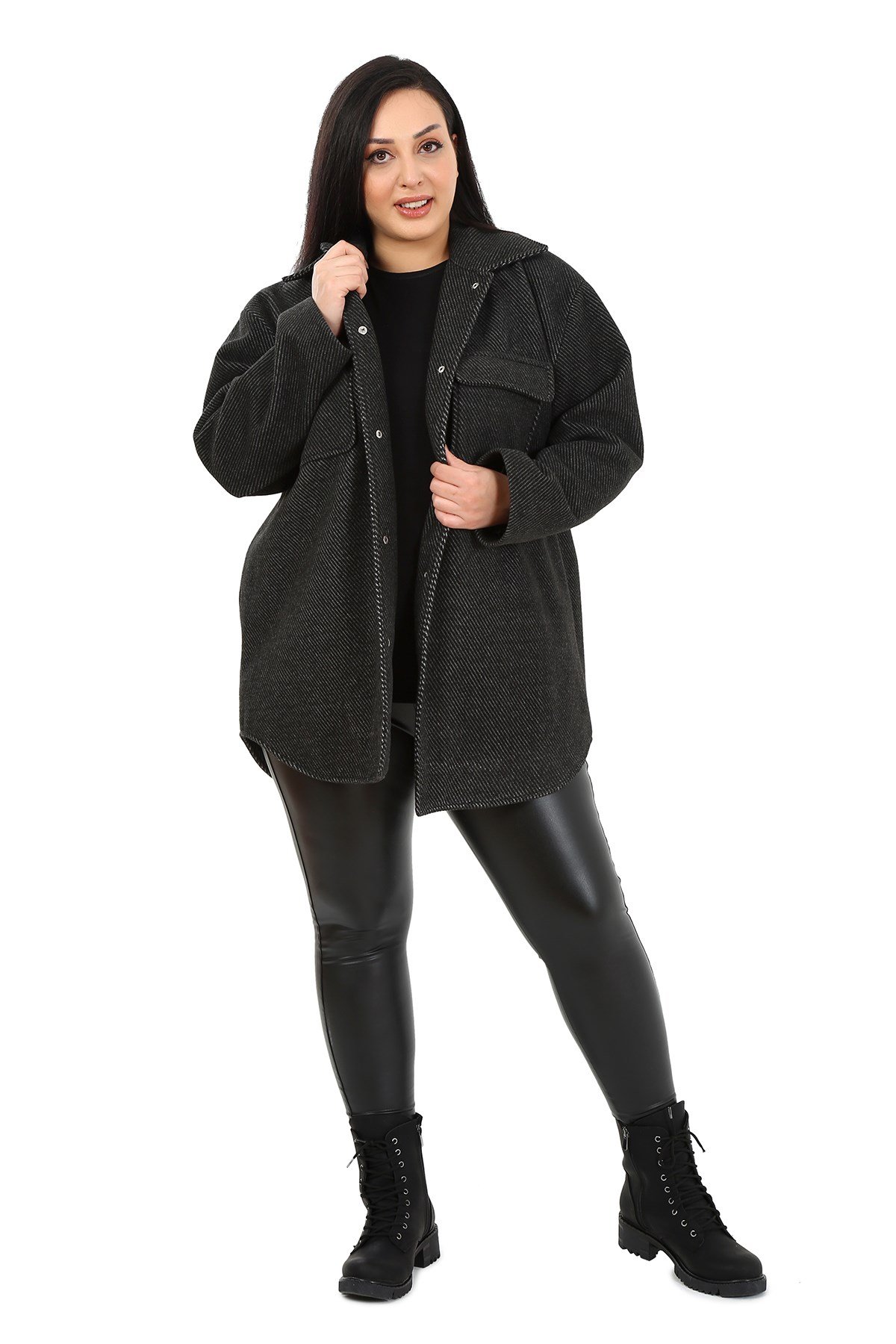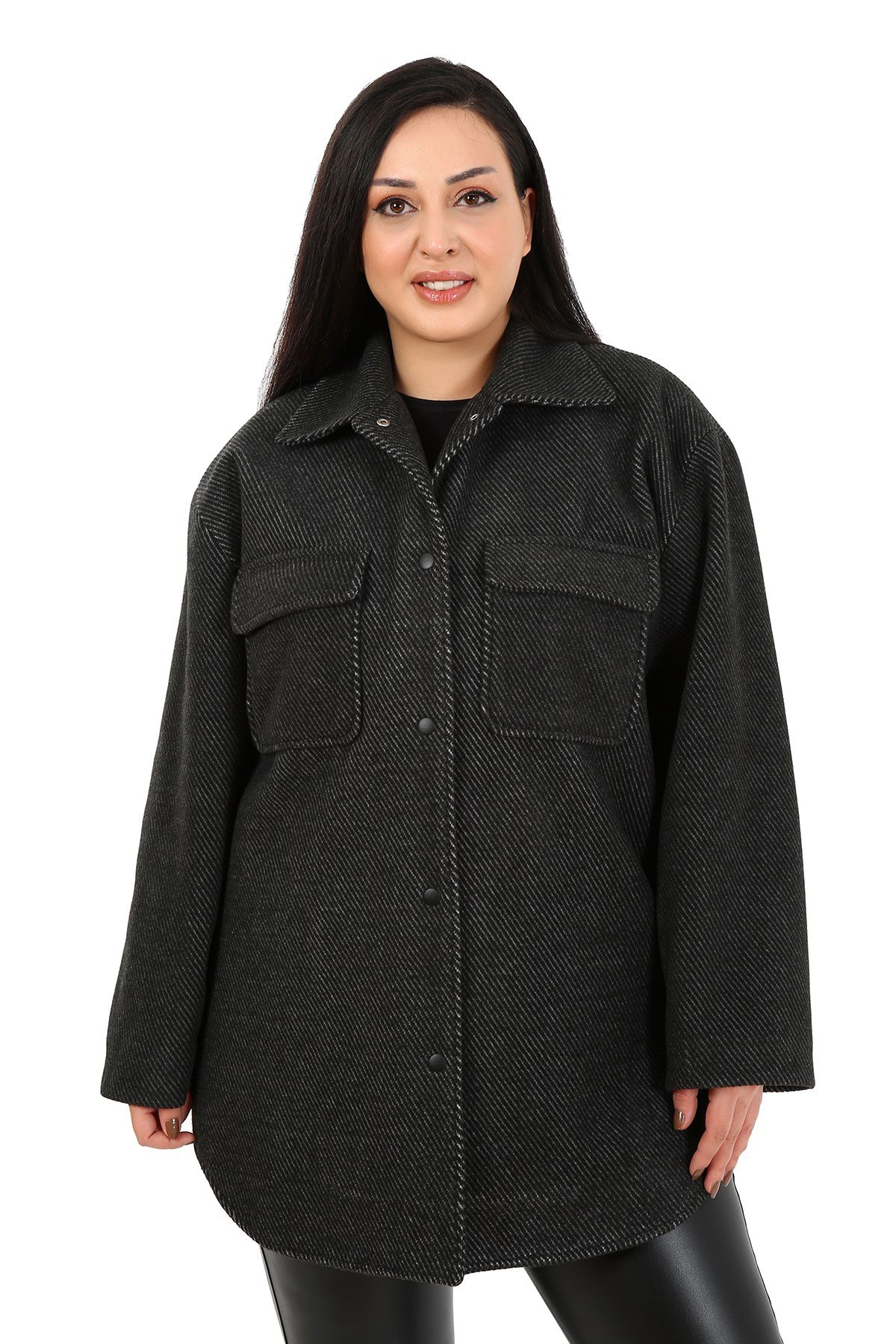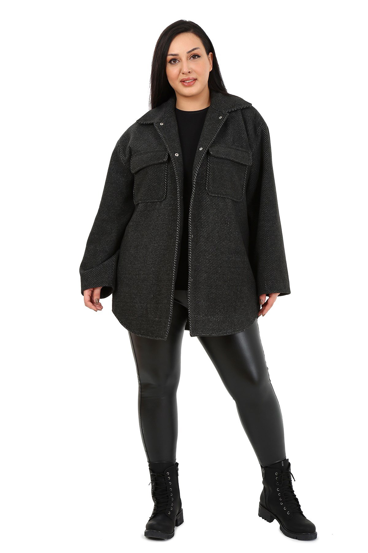 Plus size shirt collar, snap fastening, flap pockets, lined herringbone woven coat.