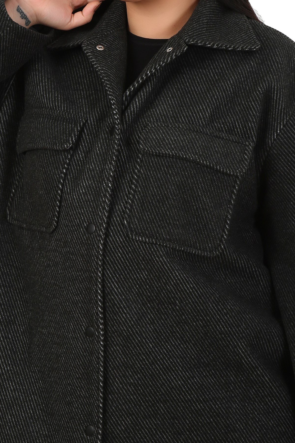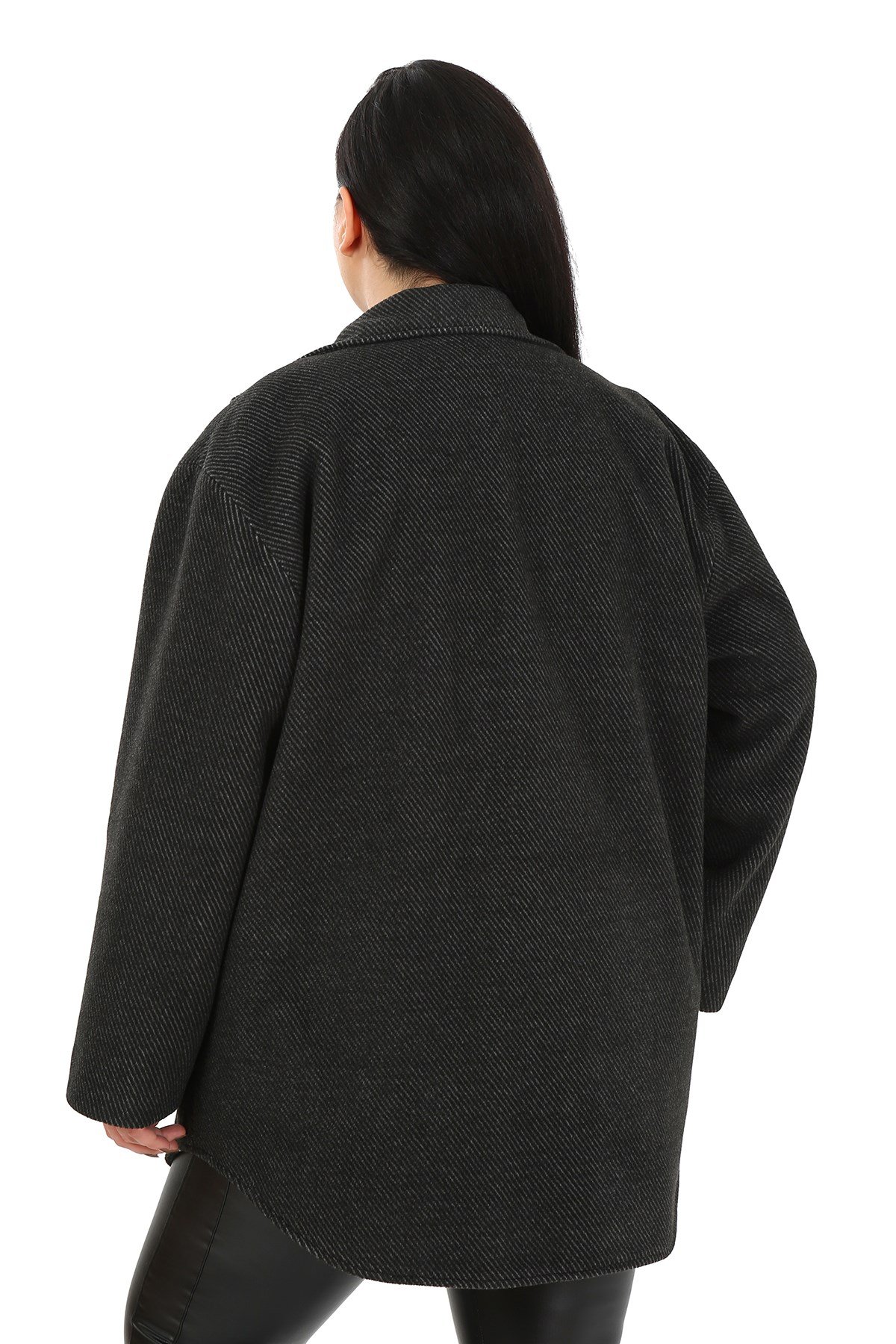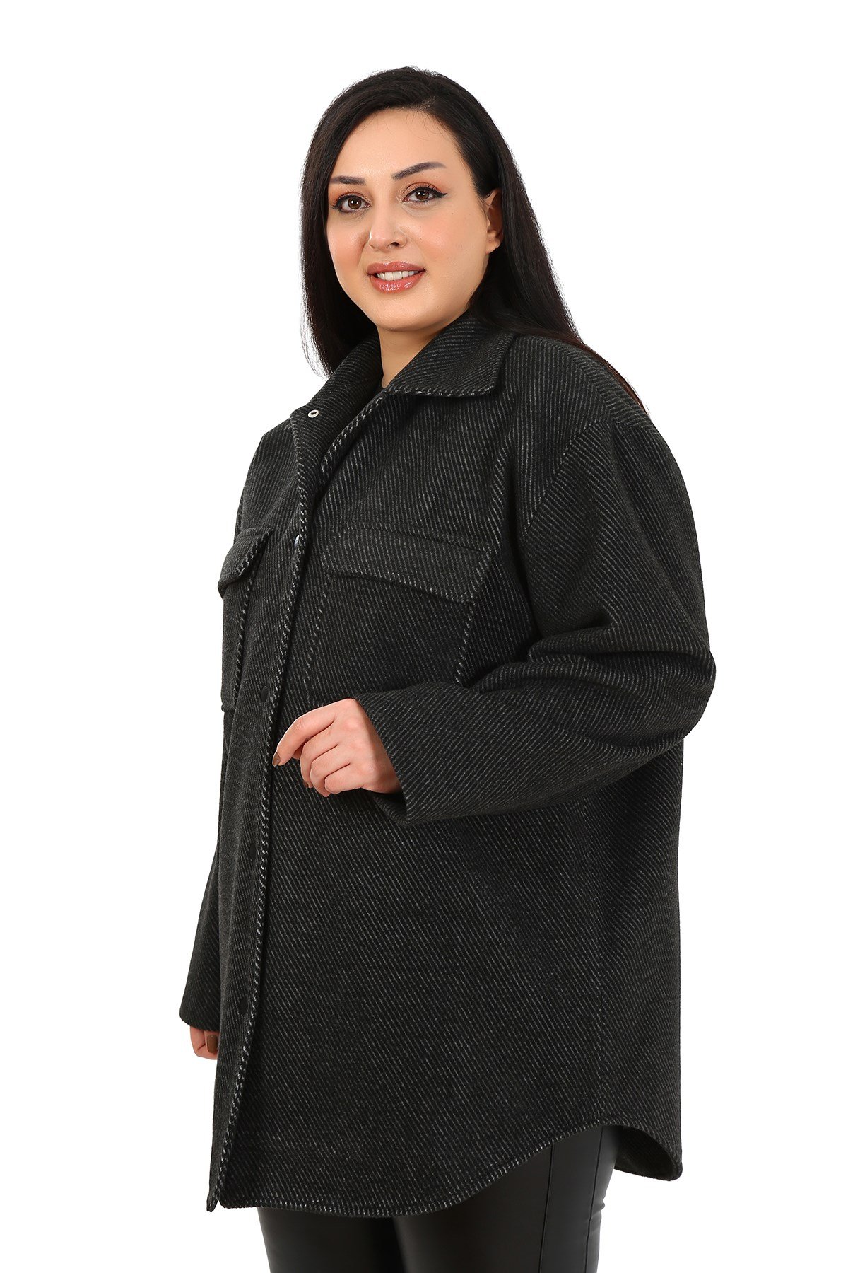 Plus size shirt collar, snap fastening, flap pockets, lined herringbone woven coat.