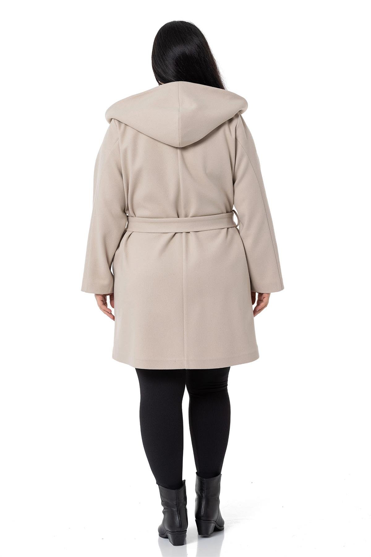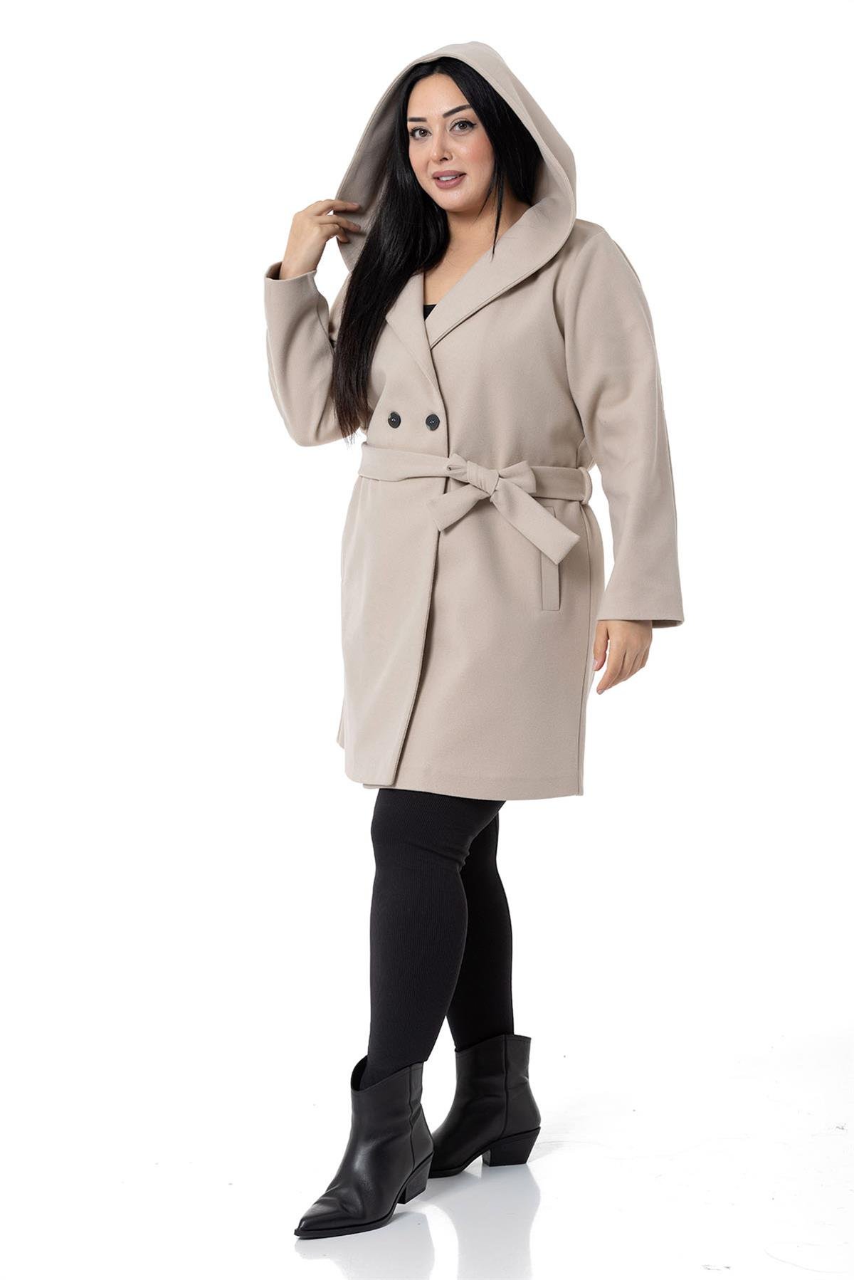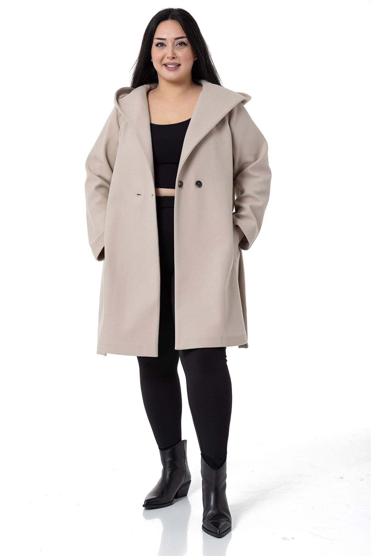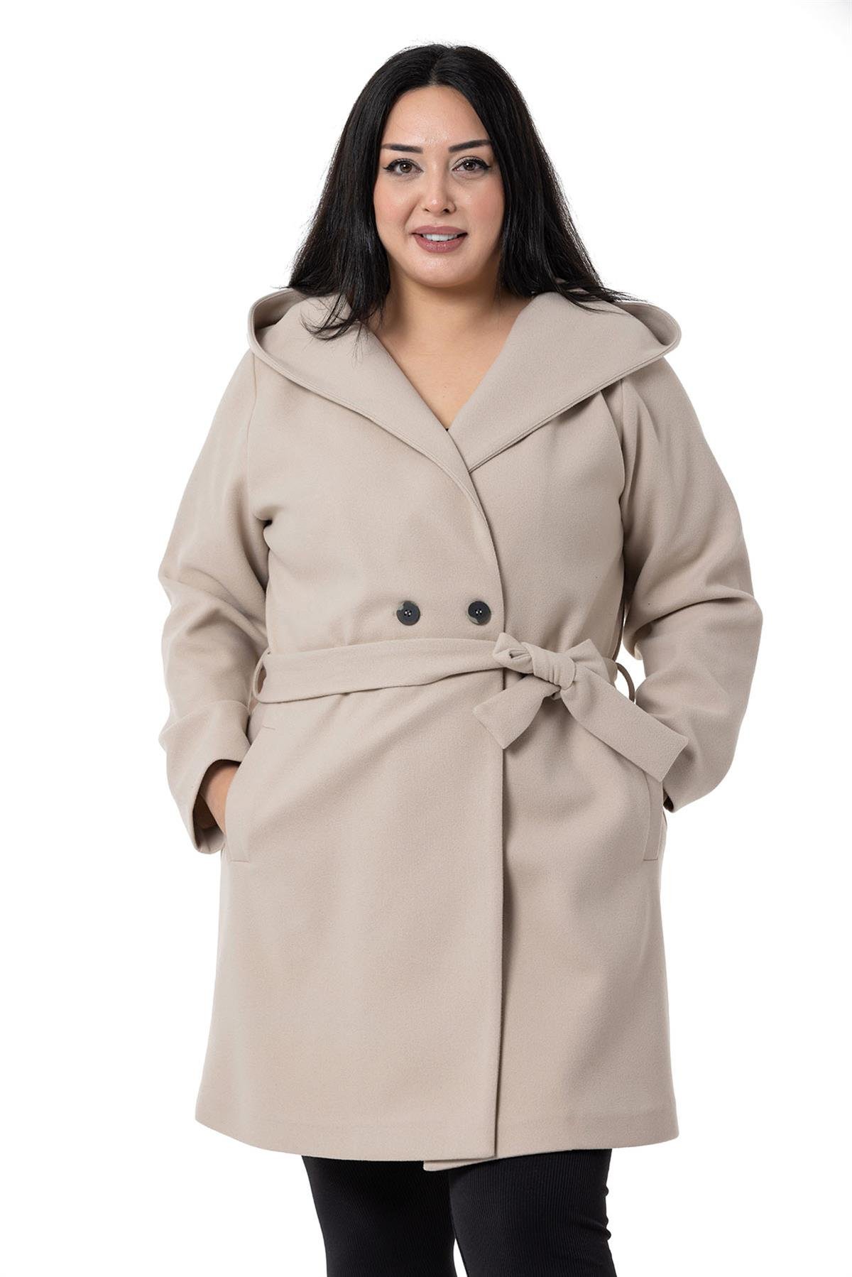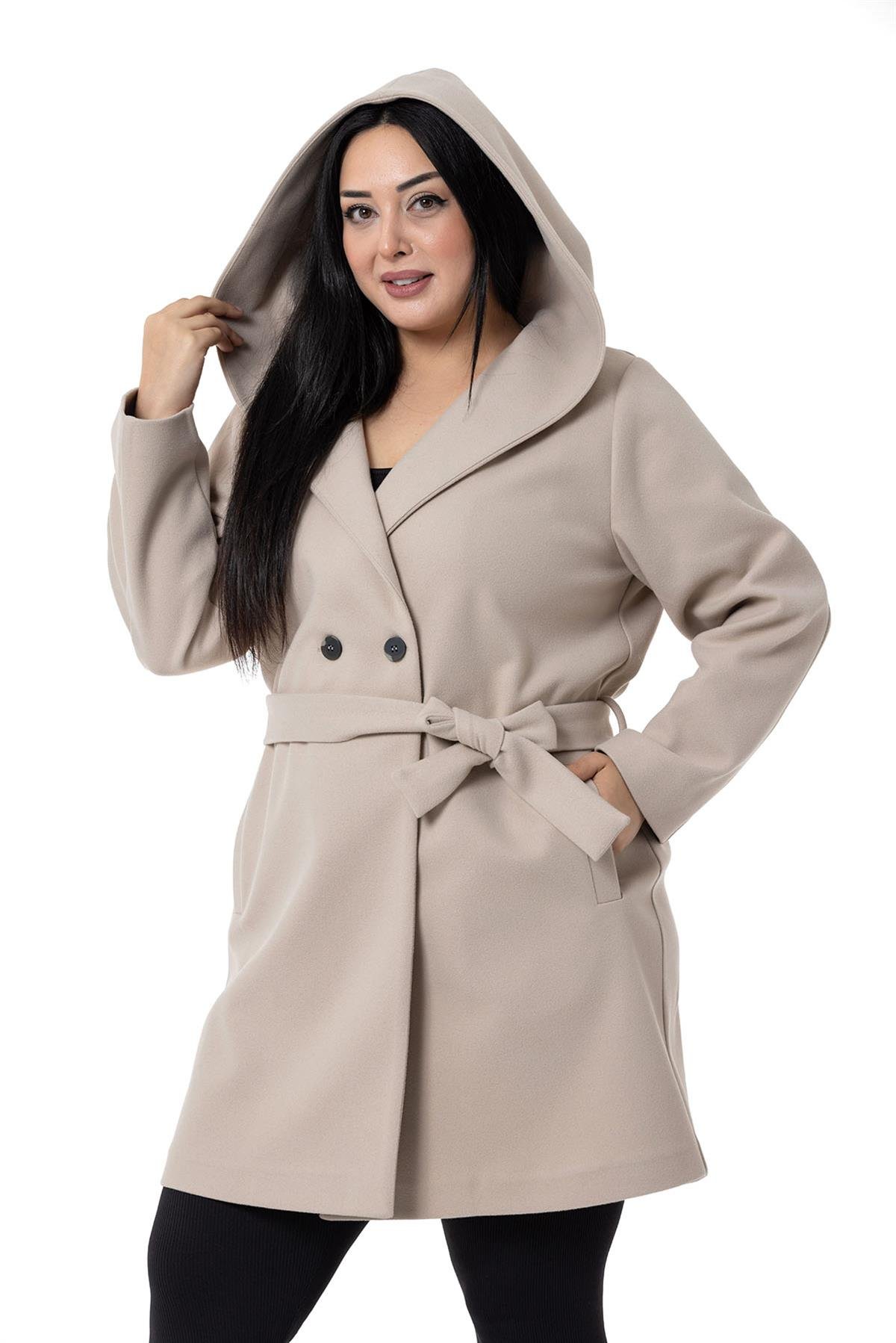 Plus Size Hooded Beige Overcoat with Pockets and Belt