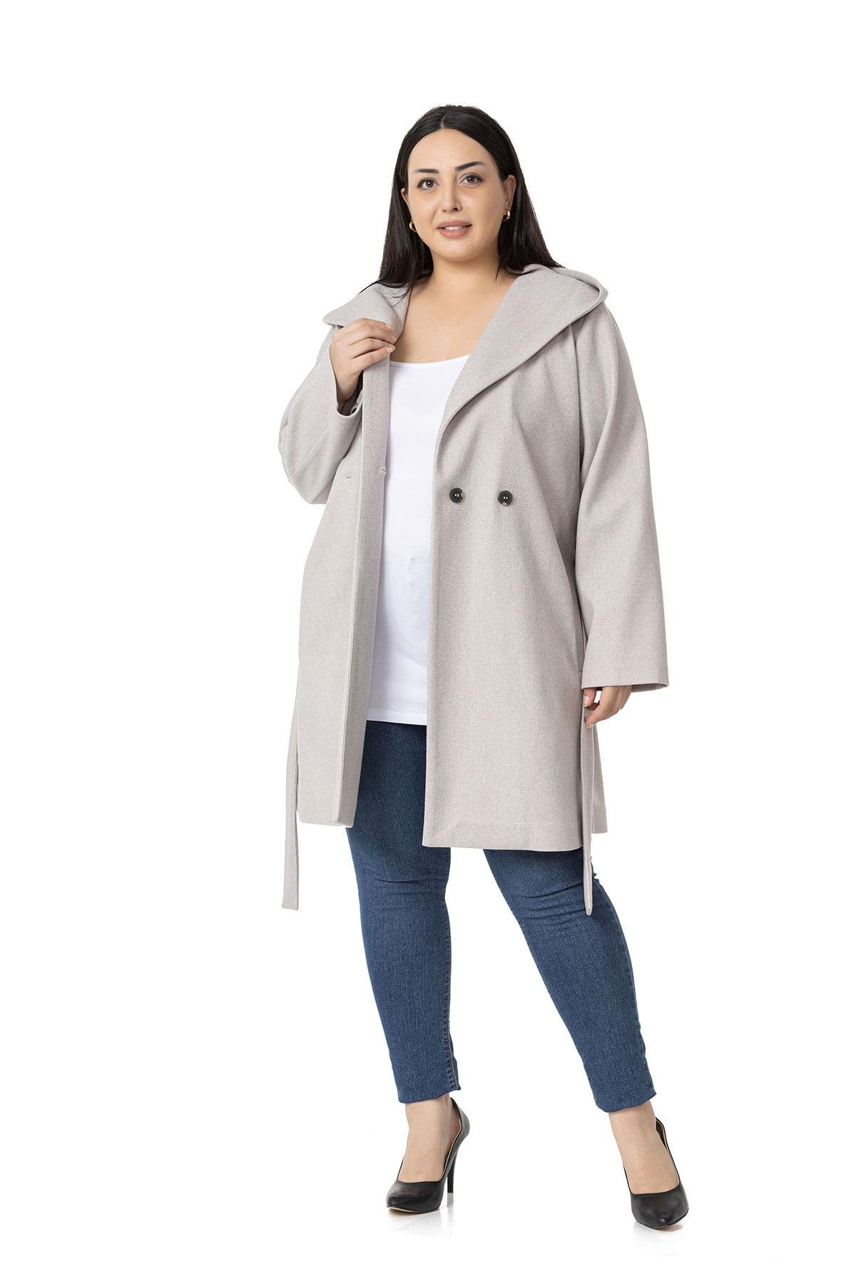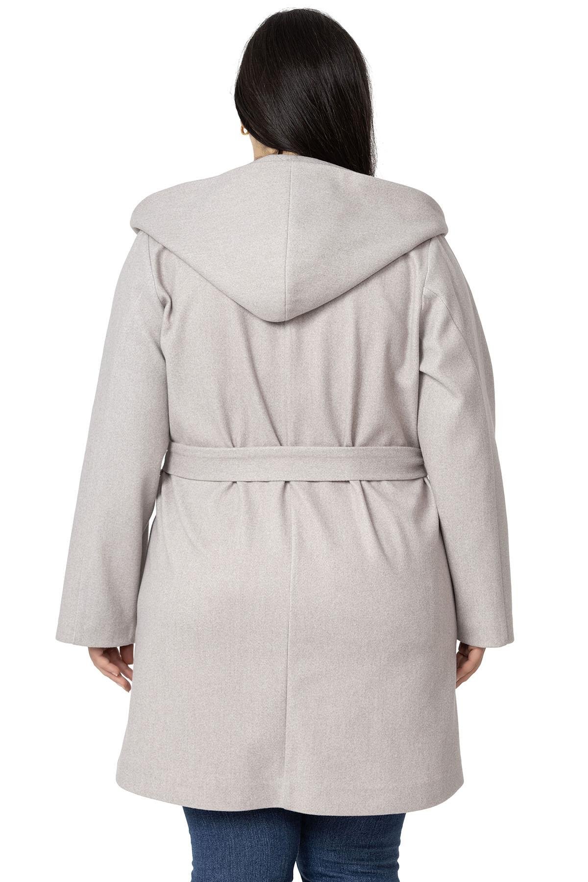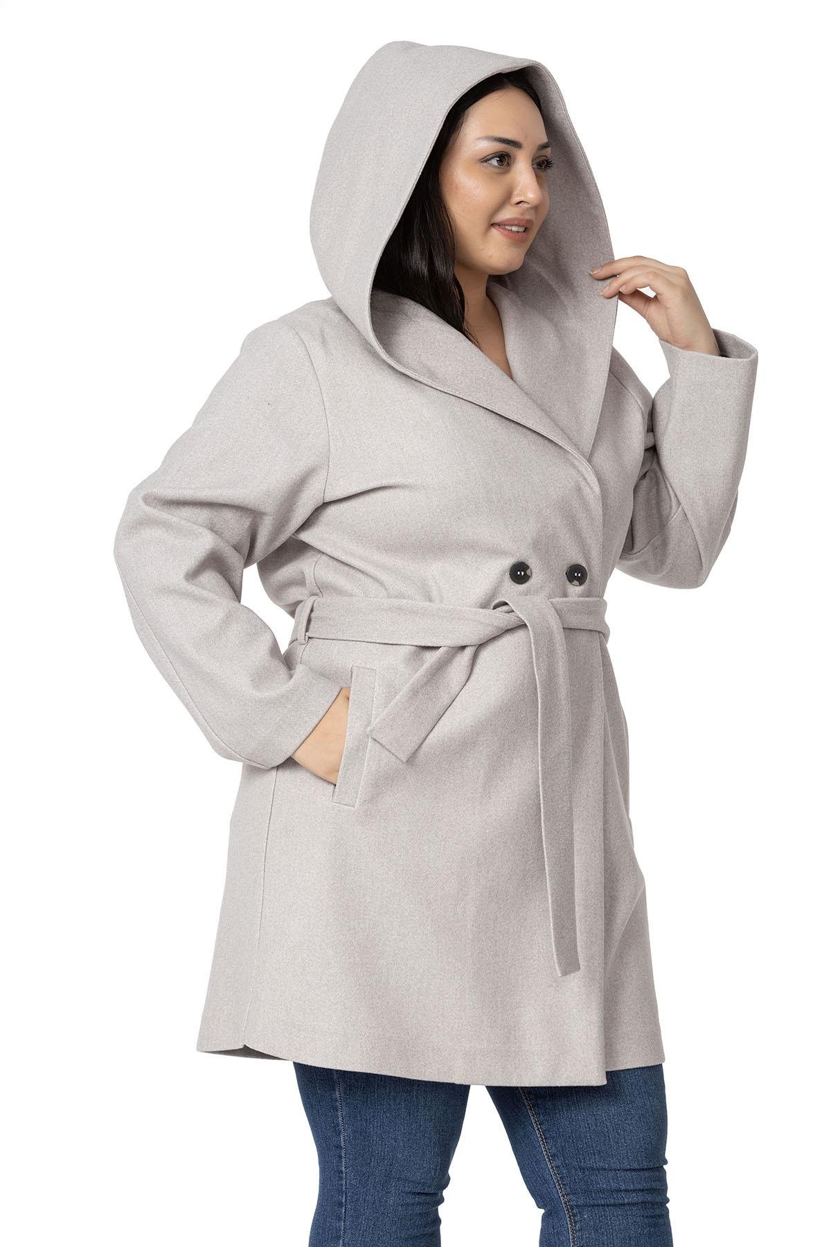 Plus size hooded, button-fastened, flap pockets, belted unlined coat.