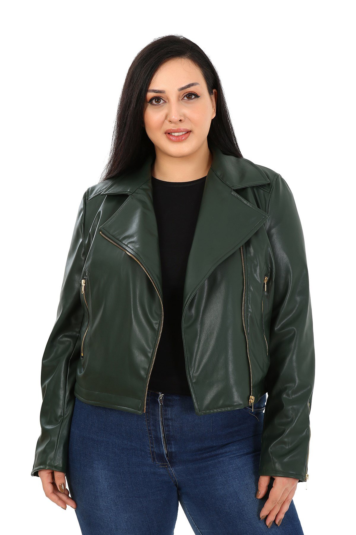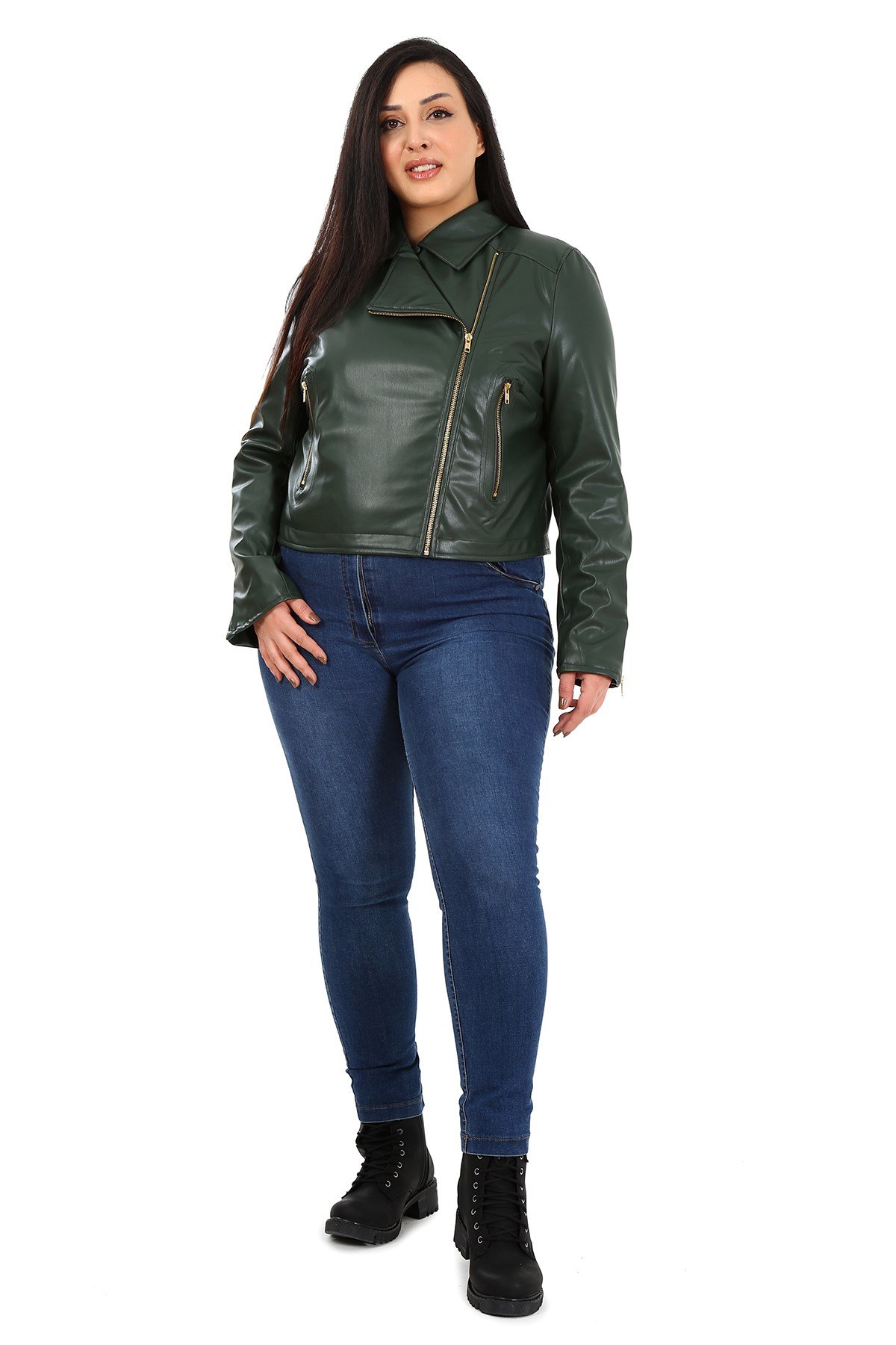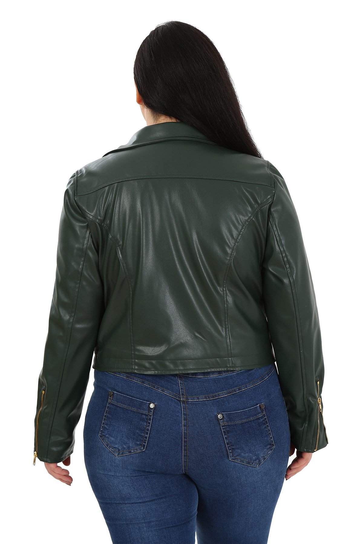 Plus size double-breasted sleeves, zipper detail, pockets, lined short faux leather coat.
