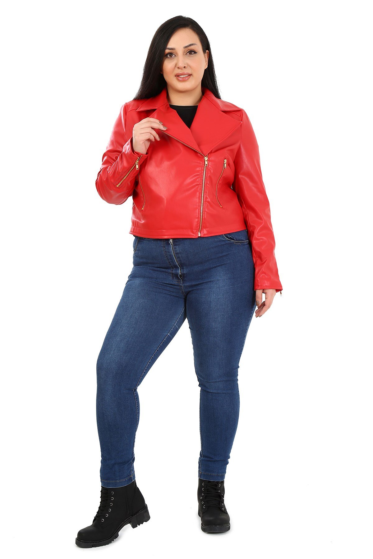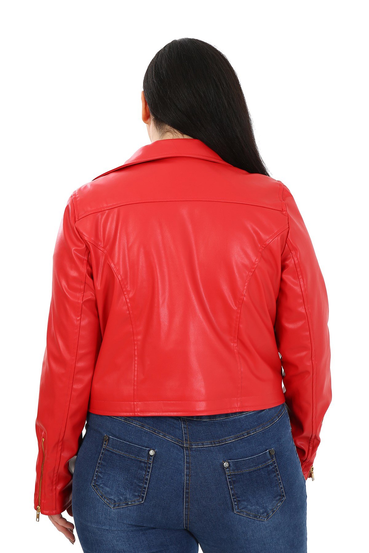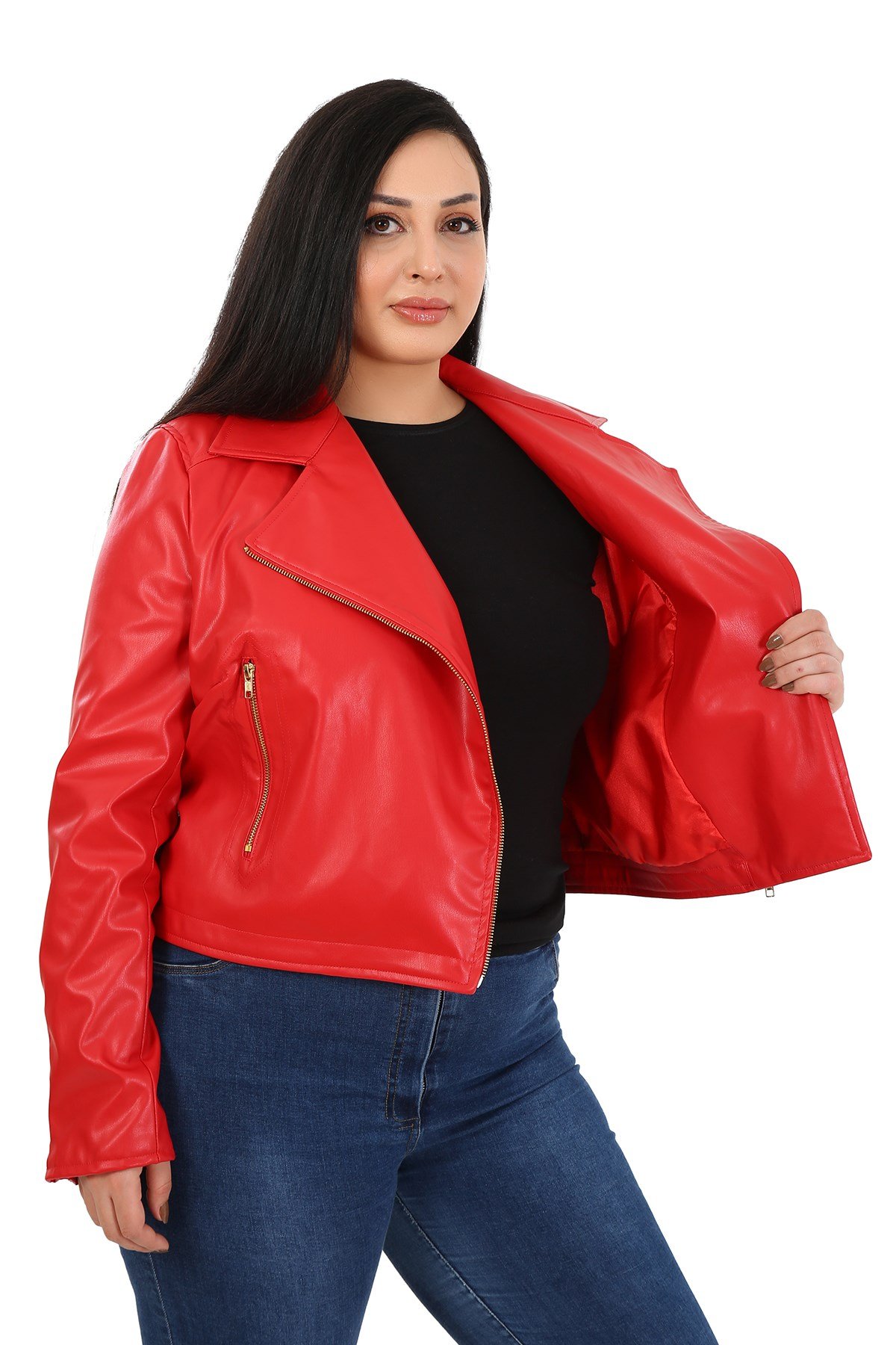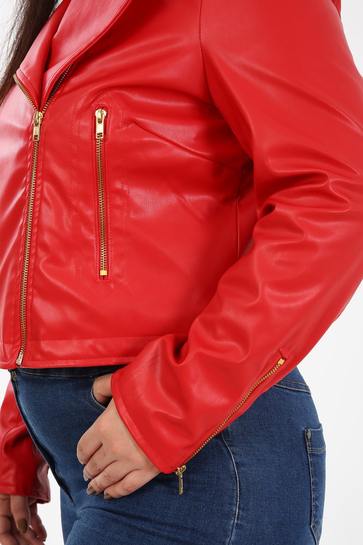 Plus Size Red Short Leather Coat with Zipper Detailed Pockets
