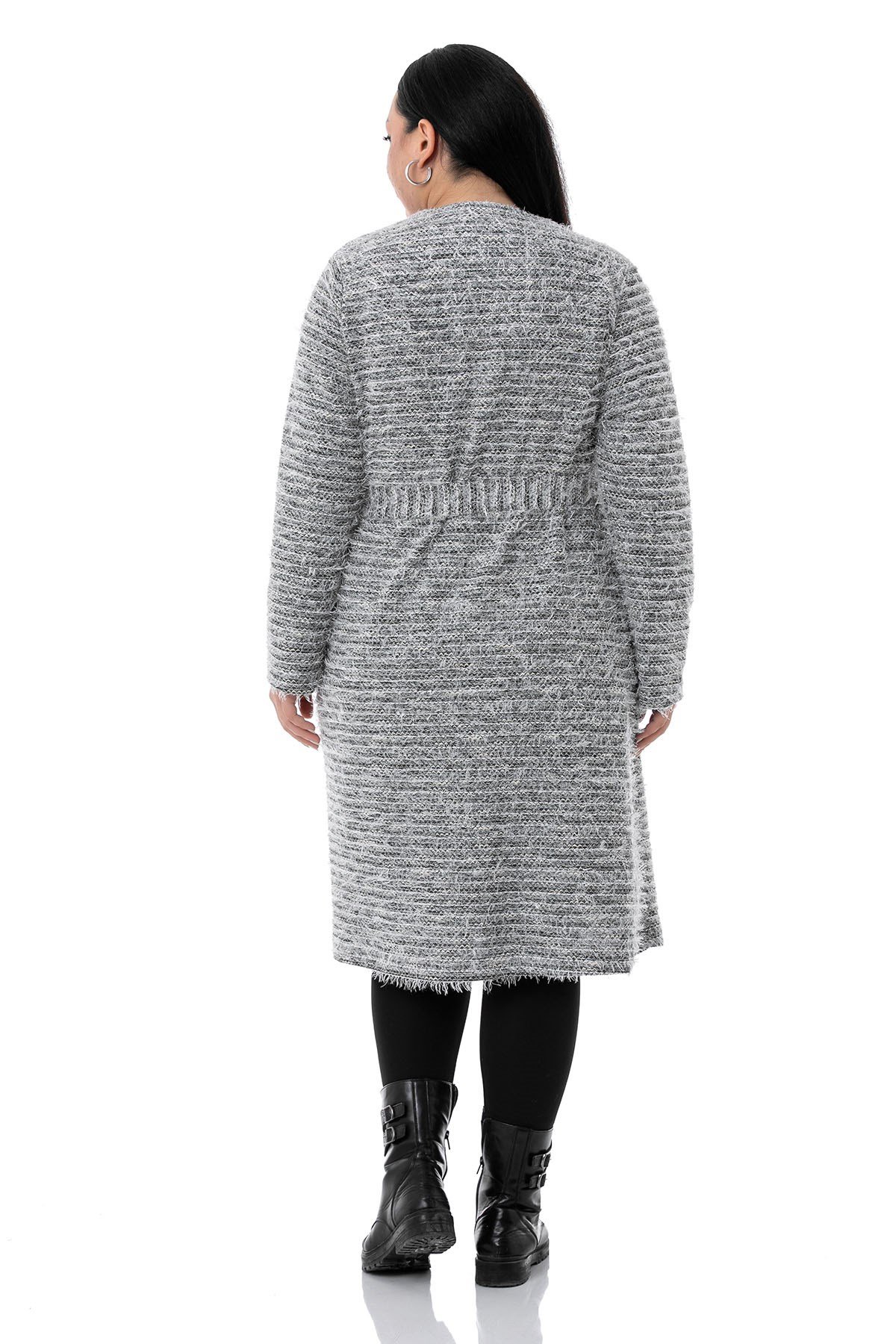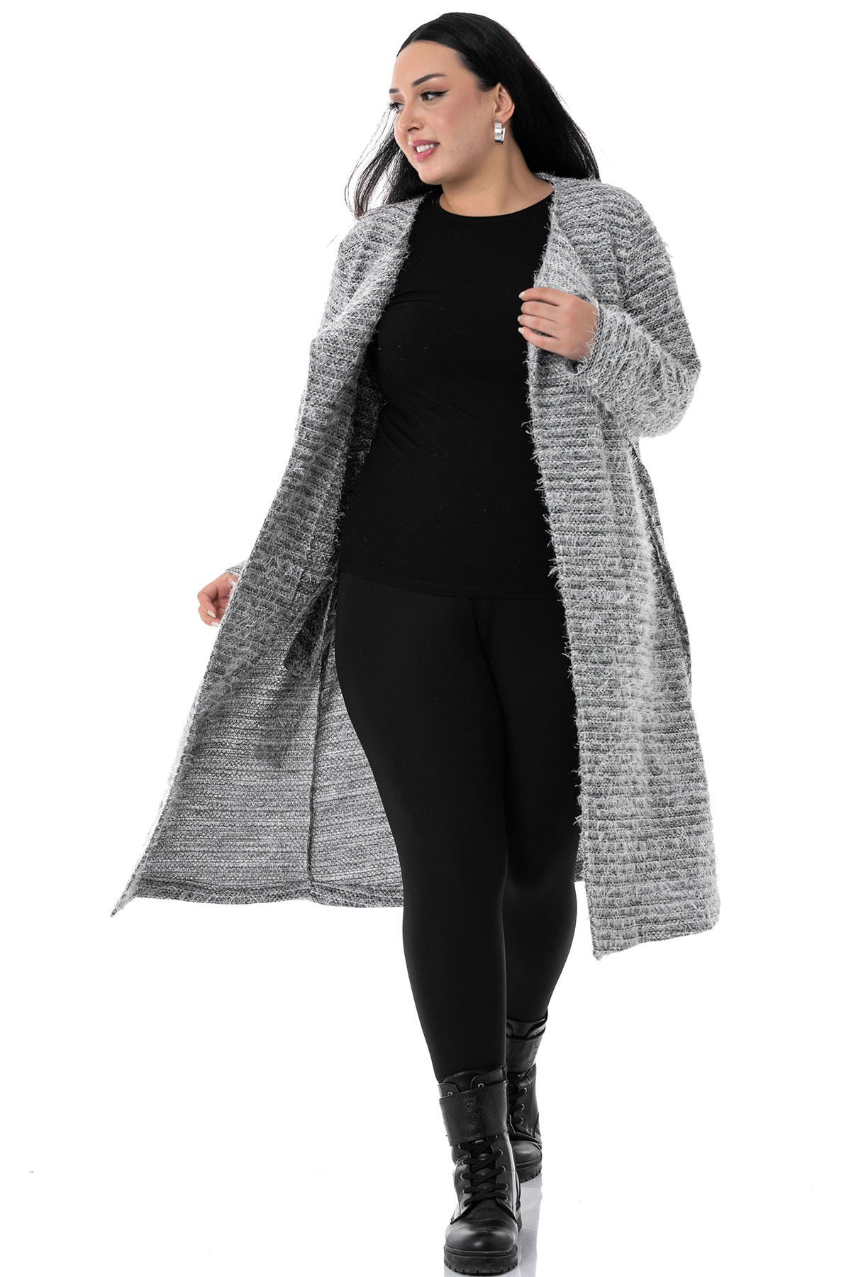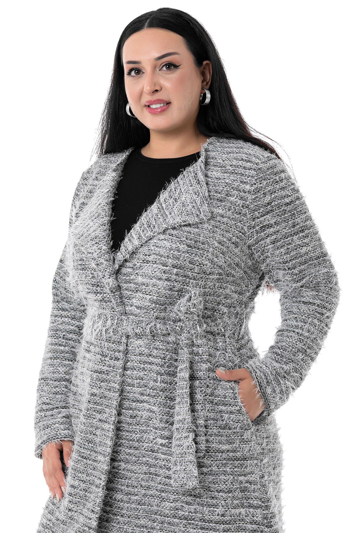 Plus Size Shawl Collar Midi Size Pocket Belted Gray Cardigan
