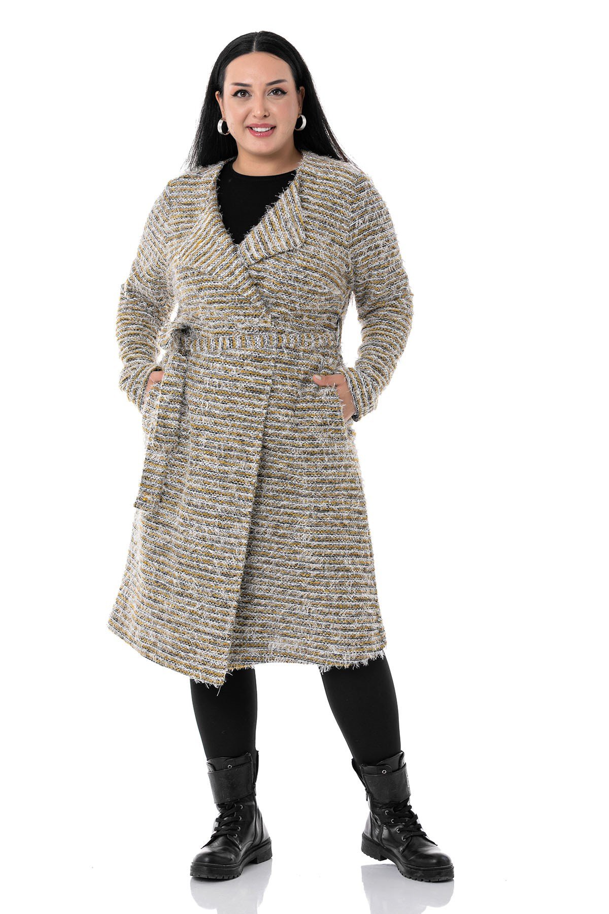 Plus size shawl collar midi length cardigan with pockets and belt.